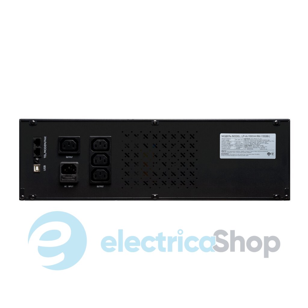 Джерело безперебійного живлення LP-UL1550VA RM (rack mounts) (with battery) (лінійно-інтерактивний тип) має показник потужності - 1550/900 VA/W і вхідну напругу - 220/230/240 ± 10% V. Захисний функціонал інтерактивного джерела безперебійного живлення LP-UL1550VA RM (rack mounts) (with battery) має наступні типи захисту: від короткого замикання, стрибків напруги, перевантаження, розряду і надлишкового заряду батарей. Автопідзарядка пристрою виконується у вимкненому стані. Має 2 євророзетки, функції холодного старту та повторного запуску при відновленні напруги в мережі. ДБЖ має технологію триступінчастої зарядки АКБ, що значно скорочує час перезарядки. Завдяки технології інтелектуального керування акумулятором його заряджання відбувається з урахуванням температурної компенсації, що збільшує термін служби акумулятора.