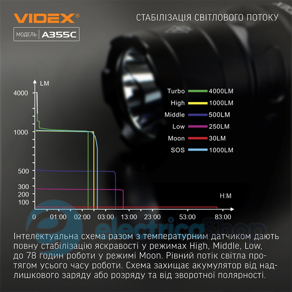 Стабілізація світлового потоку для режимів HIGH, MIDDLE, LOW, MOON. Рівна яскравість без вагань. Система температурного регулювання захищає світлодіод і акумулятор від перегріву. Гумові кільця ущільнювачів для використання акумуляторів 18650 в комплекті.
