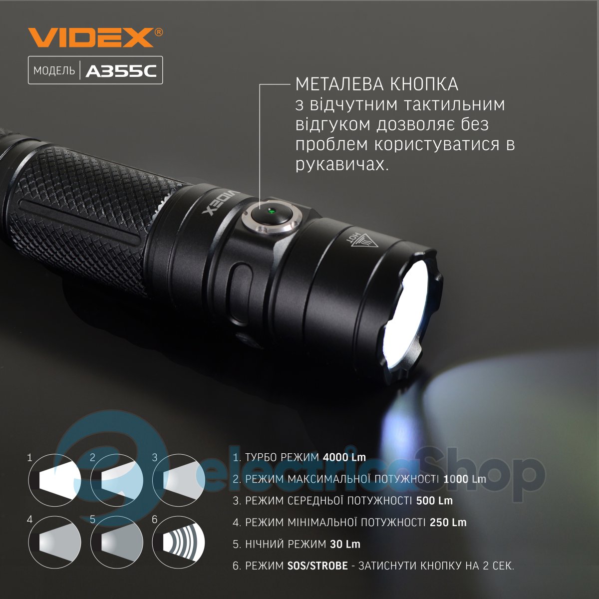 Короткочасне натискання кнопки при увімкненому світлі дозволяє вибрати необхідний режим роботи ліхтаря: