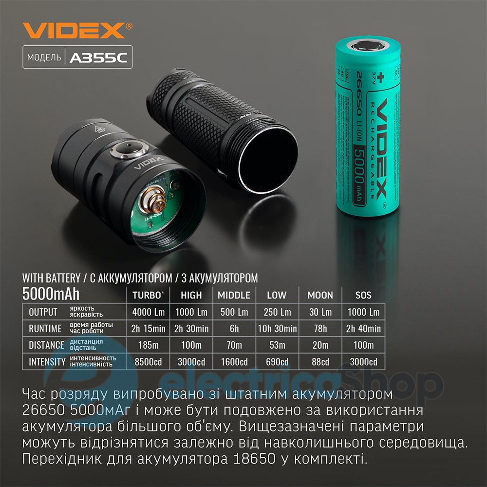 TURBO (Турбо режим) - з найбільшою яскравістю світла 4000Lm. Дистанція освітлення налічує 185м. Тривалість роботи 2 години 15хв. Інтенсивність світлового потоку 8500cd.