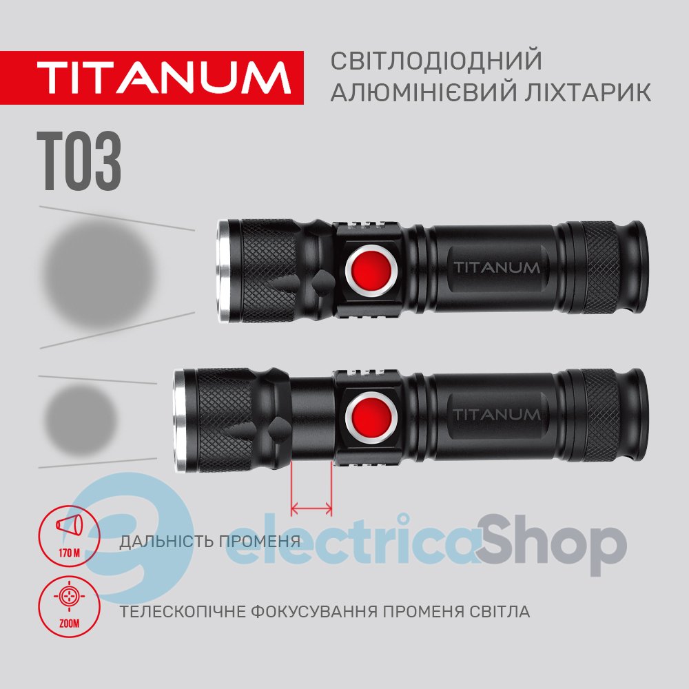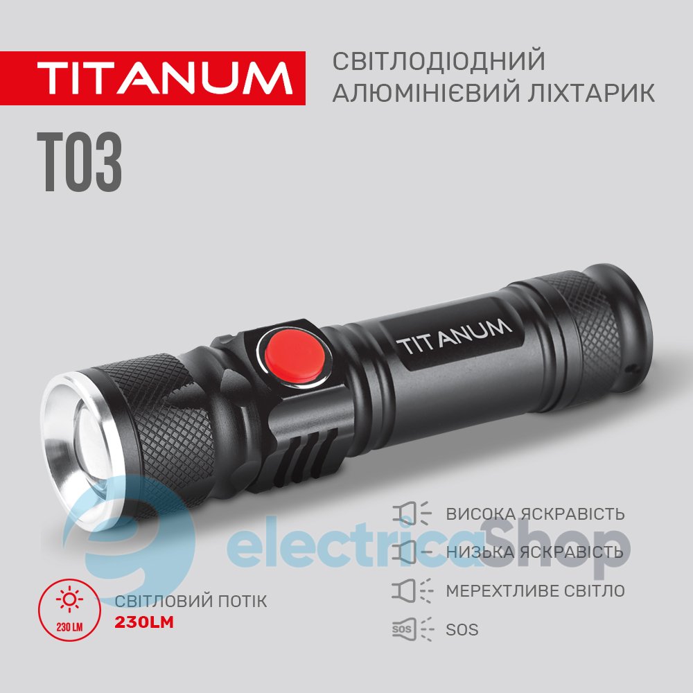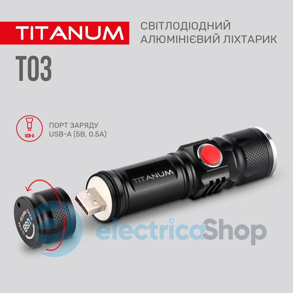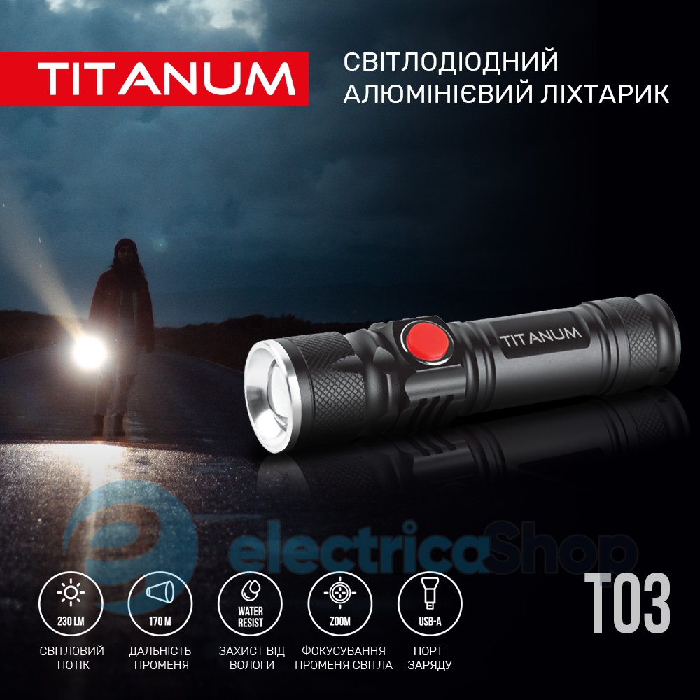 Портативний світлодіодний ліхтарик TITANUM TLF-T03 230Лм 6500K має компактні розміри та не займає багато місця. Підходить для застосування у побуті, а також буде гарним помічником в процесі виконання робіт, коли потрібно підсвітити певні зони. Ліхтарик має вбудований акумулятор. Особливість даної моделі – можливість прямого заряджання ліхтарика за допомогою порту USB, а також функція фокусування.