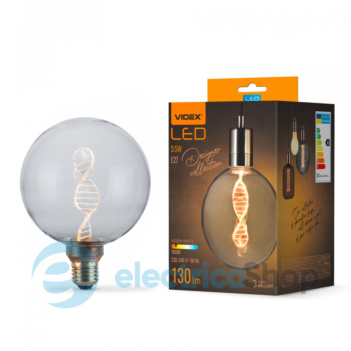 LED лампа VIDEX Filament VL-DNA-G125-C 3.5W E27 1800K є однією з ламп нашої дизайнерської колекції. Даний виріб має форму великої прозорої кулі, в середині якої розташована спіральна світлодіодна нитка, що нагадує молекулу ДНК. LED лампа створює тепле світло (1800К), яке буде ідеальним рішенням для створення затишної атмосфери як у вашій спальні, вітальні, так і в ресторанах, кафе. Клас енергоспоживання A свідчить про те, що лампа є енергоефективною – вона споживає менше електроенергії, забезпечуючи при цьому гарну яскравість. Окрім того, даний виріб має тривалий строк служби – 20 000 годин. Гарантійний термін виробу – 3 роки.
