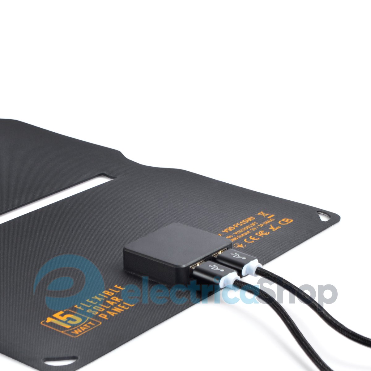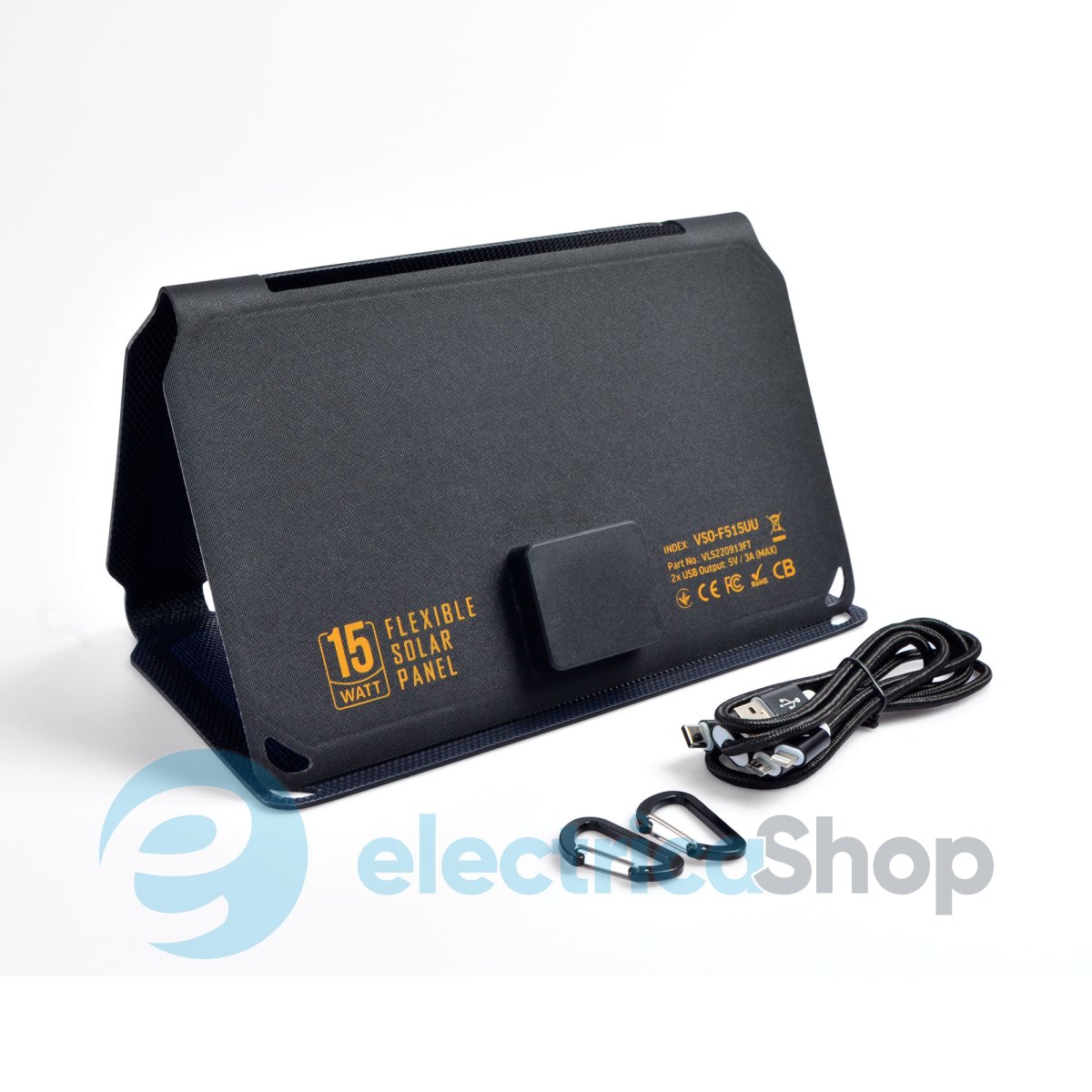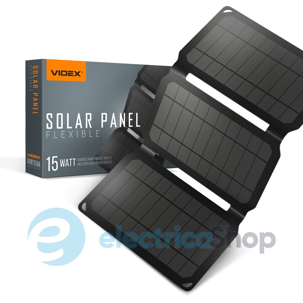 Портативний сонячний зарядний пристрій VIDEX F515UU 15W, який може перетворювати сонячне світло на електрику для негайного виробництва відновлюваної енергії. Він може заряджати різноманітні пристрої, такі як мобільний телефон, планшет, павербанк тощо, має два USB виходи.
