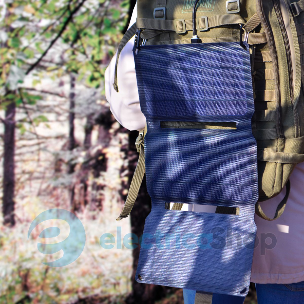 Рекомендується розміщувати панель перпендикулярно сонячним променям, щоб отримати максимальну продуктивність.В комплект входить USB кабель довжиною 1м з різними виходами (Type-C, Micro USB, Lightning) для заряджання ваших гаджетів, а також два карабіни для зручної фіксації панелі.