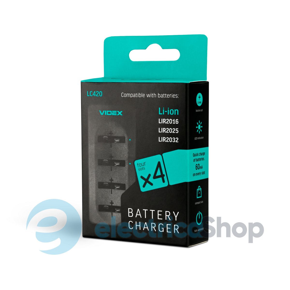 Зарядний пристрій Videx VCH-LC420 - призначений для багаторазового заряду літій-іонних (Li-ion) кнопкових акумуляторів, таких як LIR2016, LIR2025, LIR2032. Зарядний пристрій має чотири незалежних гнізда для заряду. Струм заряду визначається автоматично. Пристрій оснащено LED індикацією. Струм заряду 60мА, напруга заряду 4.2В.