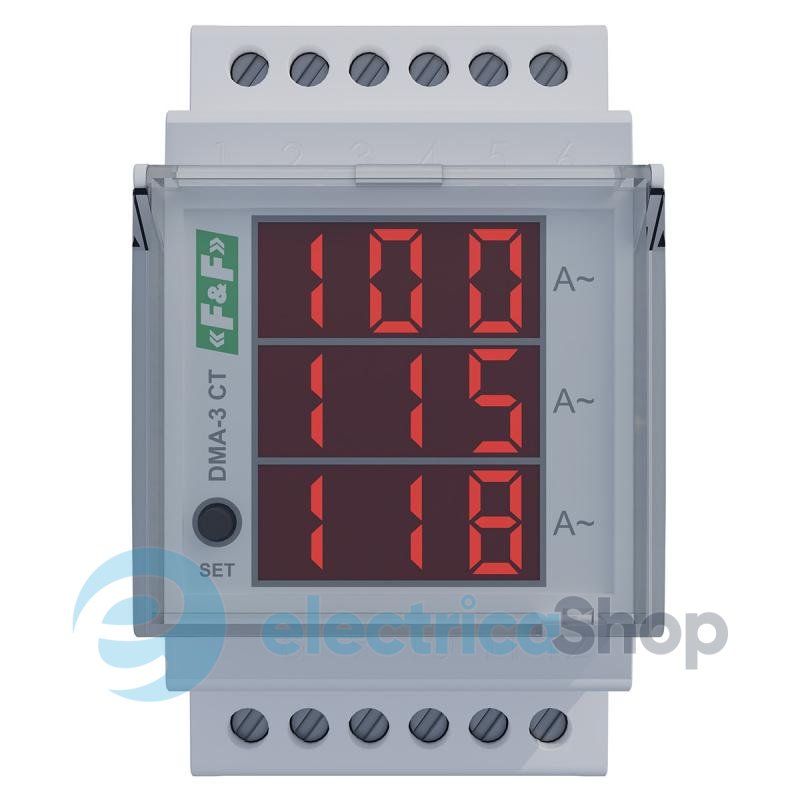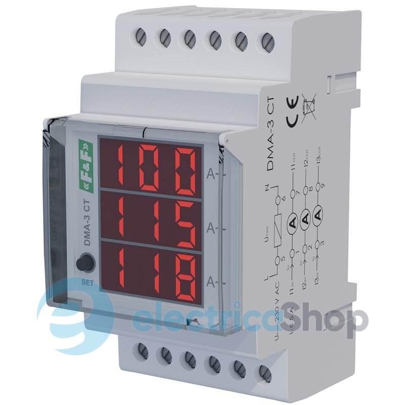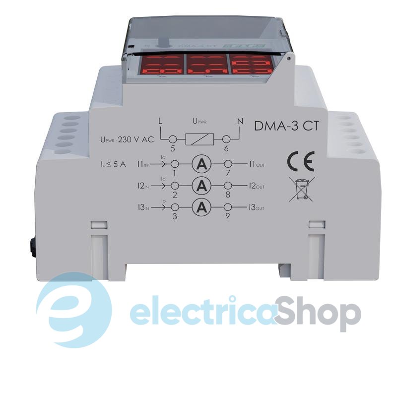 Дія Індикатор постійно вимірює середньоквадратичне значення струму, результат якого відображається на 3-рядковому 3-значному сегментованому дисплеї, розташованому на передній панелі пристрою. Індикатор дозволяє встановити значення підключених трансформаторів струму, щоб значення, що відображається на дисплеї, відповідало фактичному значенню струму. DMA-3 CT призначений для монтажу в розподільному щитку безпосередньо на DIN-рейку 35 мм.