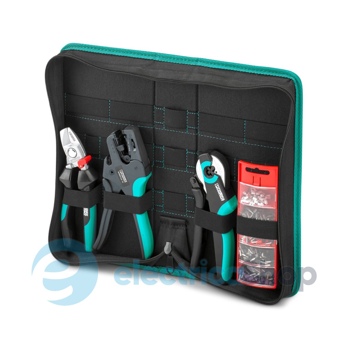 Набор инструментов для резки, снятия изоляции и обжима, упакованный в футляр, состоит из: CUTFOX 18, WIREFOX 10, CRIMPFOX CENTRUS 10S, AI SORTI BOX RD, TOOL-KIT STANDARD EMPTY