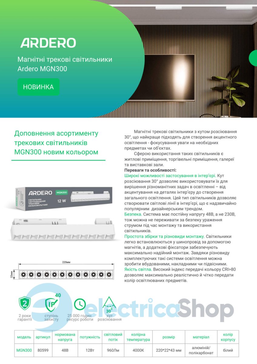 Магнитный трековый светильник Feron Ardero MGN300 12W 4000K 80599 предназначен для создания акцентного освещения, создает фокус на необходимых предметах или объектах. Используется в жилых и коммерческих помещениях, галереях и торговых залах. Угол рассеивания 30° позволяет использовать модель для решения различных задач в освещении, создания светловых линий в интерьере. Светильники легко устанавливаются с помощью магнитов, фиксаторы обеспечивают максимально надежный монтаж в шинопроводе. Высокий индекс цветопередачи Ra>80 позволяет максимально реалистично передать цвет освещаемых предметов.