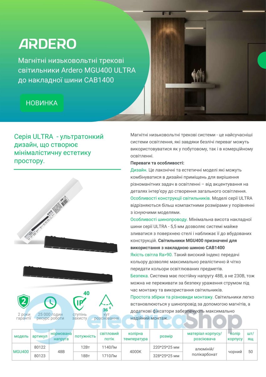 Магнитный трековый светильник Feron Ardero MGU400 ULTRA 12W 4000K 80122 предназначен для создания акцентного освещения, создает фокус на необходимых предметах или объектах и отличается компактным дизайном. Используется в жилых и коммерческих помещениях, галереях и торговых залах. Угол рассеивания 36° позволяет использовать модель для решения различных задач в освещении, создания светловых линий в интерьере. Светильники легко устанавливаются с помощью магнитов, фиксаторы обеспечивают максимально надежный монтаж в шинопроводе. Высокий индекс цветопередачи Ra>90 позволяет максимально реалистично передать цвет освещаемых предметов.
