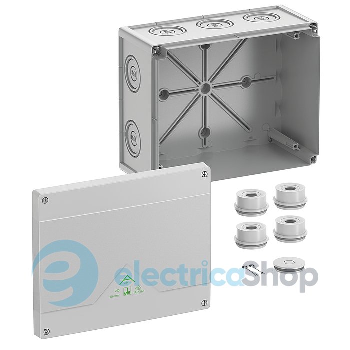 Распределительная коробка, класс защиты IP55/IP66, номинальное поперечное сечение 25 мм², сертифицирована VDE (DIN EN 60670-1/-22 (VDE 0606-1/-22), DLG (устойчивость к аммиаку), выбивные отверстия, M20/M25/M40/M50, (4 задних, 10 боковых), внутренние точки крепления, для стандартного внутреннего и защищенного наружного монтажа.