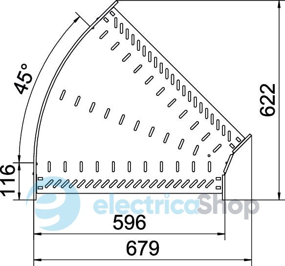 Угловая секция 45° для создания горизонтального ответвления, фасонная деталь для защелкиваемых и привинчиваемых кабельных лотков, высота боковой стенки 60 мм. Безвинтовой монтаж с помощью двойных зажимов или резьбовое соединение посредством винтов с полукруглой низкой головкой FRS и комбинированных гаек M6. Можно использовать в помещении. Крепежный материал заказывается отдельно.