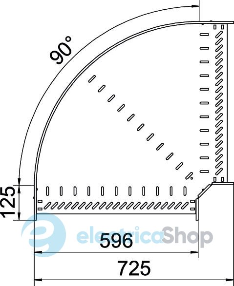 Угловая секция 90° для создания горизонтального ответвления, фасонная деталь для защелкиваемых и привинчиваемых кабельных лотков, высота боковой стенки 60 мм. Безвинтовой монтаж с помощью двойных зажимов или резьбовое соединение посредством винтов с полукруглой низкой головкой FRS и комбинированных гаек M6. Можно использовать в помещении. Крепежный материал заказывается отдельно.