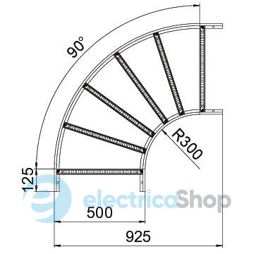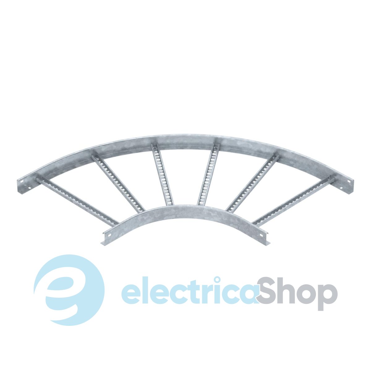 Горизонтальная угловая секция 90° с приваренной перекладиной для монтажа на любых кабельных лотках лестничного типа с боковыми стенками высотой 60 мм.
