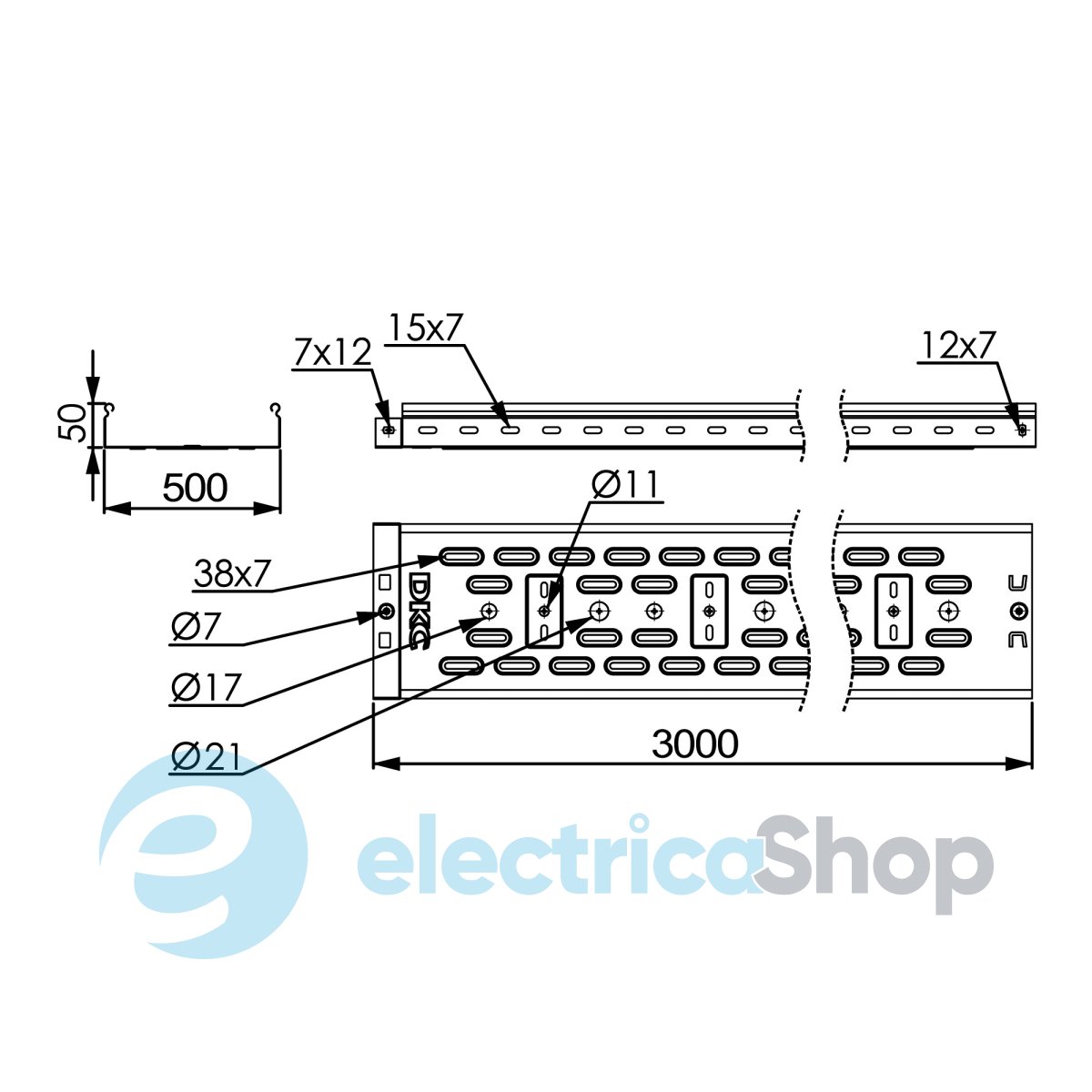Перфорированные листовые лотки ДКС применяются для прокладки кабеля как в помещении, так и на открытом воздухе. Лотки отличаются высокой несущей способностью – подформовка, производимая при производстве этой продукции, создает дополнительное ребро жесткости, что увеличивает несущую способность системы до 54%. Перфорация сокращает вес конструкции. В лотках имеются отверстия для отвода кабеля диаметром 11 мм, 17 мм, 21 мм. Степень пыле- и влагозащиты перфорированных лотков – IP 10 при использовании крышек, входящих в состав системы. Метод соединения "мама-папа" применяемый для системы, существенно сокращает время монтажа и создает непрерывный контур. Конструктив листовых лотков ДКС предупреждает повреждение кабеля при прокладке. Толщина стали – 1,0 мм, высота лотка – 50 мм, ширина – 500 мм, длина – 3000. мм. Полезное сечение – 24500 мм. Исполнение – "сталь, оцинкованная по методу Сендзимира".
