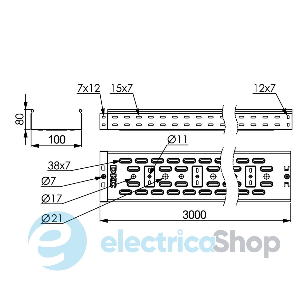 Перфорированные листовые лотки ДКС применяются для прокладки кабеля как в помещении, так и на открытом воздухе. Лотки отличаются высокой несущей способностью – подформовка, производимая при производстве этой продукции, создает дополнительное ребро жесткости, что увеличивает несущую способность системы до 54%. Перфорация сокращает вес конструкции. В лотках имеются отверстия для отвода кабеля диаметром 11 мм, 17 мм, 21 мм. Степень пыле- и влагозащиты перфорированных лотков – IP 10 при использовании крышек, входящих в состав системы. Метод соединения "мама-папа" применяемый для системы, существенно сокращает время монтажа и создает непрерывный контур. Конструктив листовых лотков ДКС предупреждает повреждение кабеля при прокладке. Толщина стали – 0,7 мм, высота лотка – 80 мм, ширина – 100 мм, длина – 3000 мм. Полезное сечение – 7800 мм. Исполнение – "сталь, оцинкованная по методу Сендзимира".