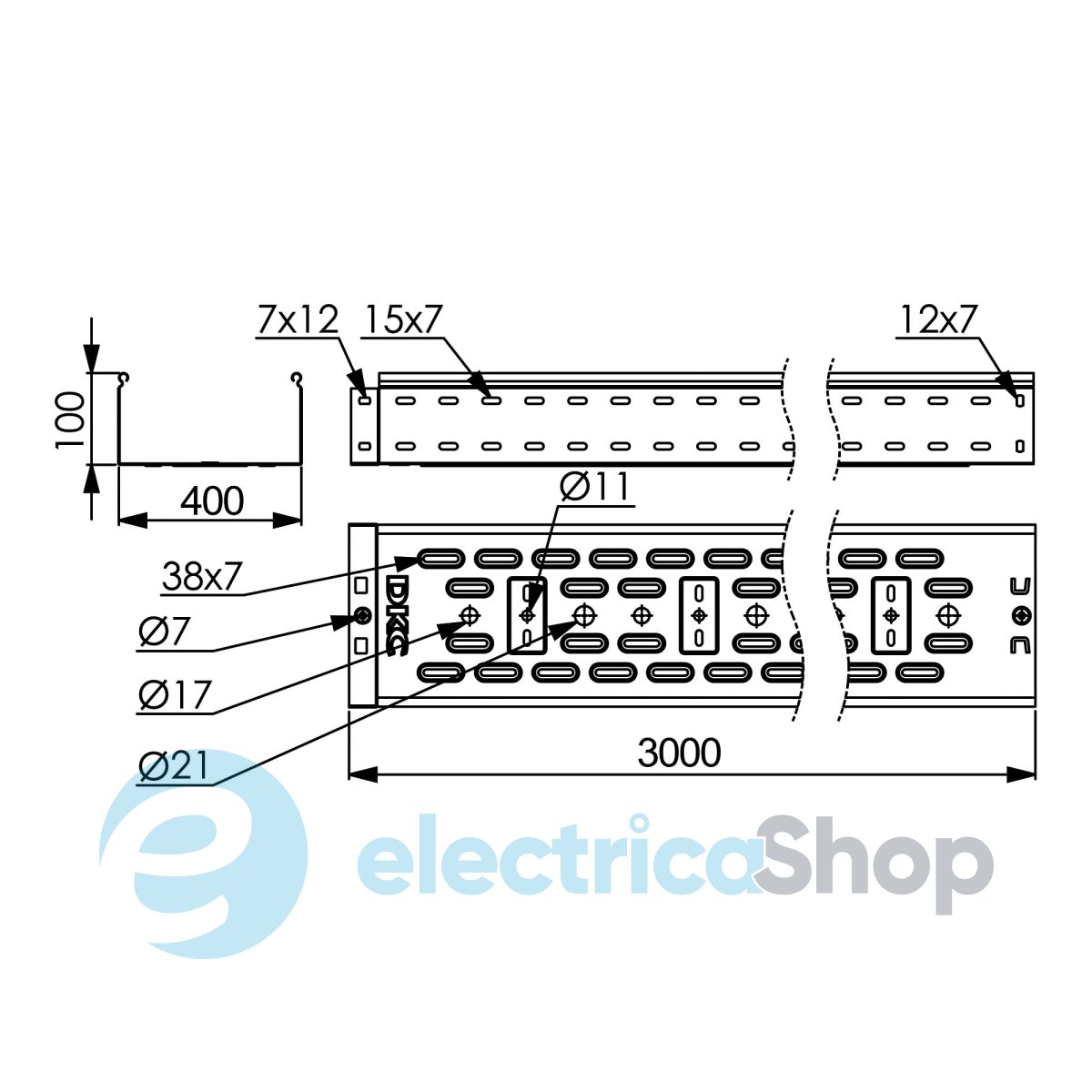 Перфорированные листовые лотки ДКС применяются для прокладки кабеля как в помещении, так и на открытом воздухе. Лотки отличаются высокой несущей способностью – подформовка, производимая при производстве этой продукции, создает дополнительное ребро жесткости, что увеличивает несущую способность системы до 54%. Перфорация сокращает вес конструкции. В лотках имеются отверстия для отвода кабеля диаметром 11 мм, 17 мм, 21 мм. Степень пыле- и влагозащиты перфорированных лотков – IP 10 при использовании крышек, входящих в состав системы. Метод соединения "мама-папа" применяемый для системы, существенно сокращает время монтажа и создает непрерывный контур. Конструктив листовых лотков ДКС предупреждает повреждение кабеля при прокладке. Толщина стали – 0,9 мм, высота лотка – 100 мм, ширина – 400 мм, длина – 3000 мм. Полезное сечение – 39500 мм. Исполнение – "сталь, оцинкованная по методу Сендзимира".