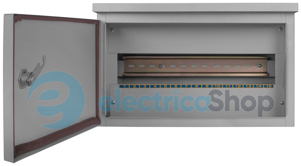 <p>Шкаф металлический 15-модульный, навесного исполнения с замком со степенью защиты IP54.</p> <h4>Основное назначение</h4> <p>Шкаф металлический модульный предназначен для монтажа модульного защитного и распределительного электрооборудования, модульных устройств автоматики, устройств управления и сигнализации в сетях 220/400В 50Гц.</p> <h4>Область применения</h4> <p>Системы энергоснабжения в жилом, офисном или производственном помещениях. А также могут быть установлены вне помещений или во влажной и запыленной среде.</p> <h4>Конструктивные особенности (преимущества)</h4> Корпус выполнен из стального листа толщиной 1 мм. <br /> Покрытие: порошковая термореактивная краска светло-серого цвета. <br /> Комплектуются DIN-рейкой, двумя ключами, информационными наклейками; фурнитурой для крепления.