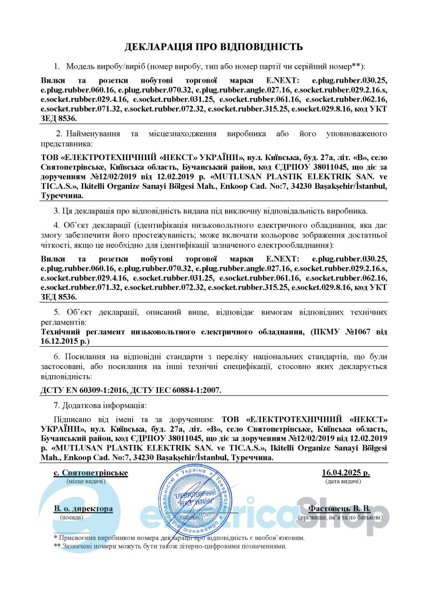 - Соответствие стандартам: ДСТУ EN 60309-1