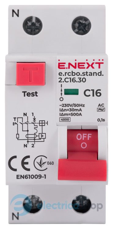 Выключатель дифференциального тока (дифавтомат) e.rcbo.stand.2.C16.30, 1p+N, 16А, C, 30мА. Устройства защитного отключения с защитой от сверхтоков (дифавтомат) предназначены для отключения участка сети при достижении тока утечки на землю заданной величины, а также от перегрузки и короткого замыкания. Дифавтоматы применяются для защиты людей от поражения электрическим током при контакте с токопроводящими частями, а также для защиты оборудования от пожаров вследствие нарушения изоляции проводки, перегрузки и КЗ.