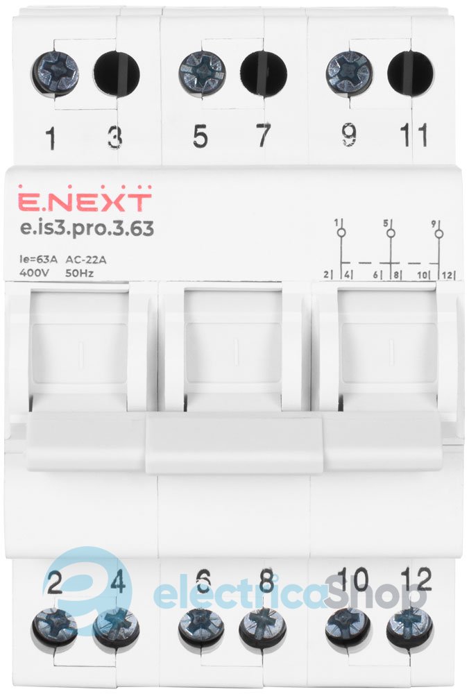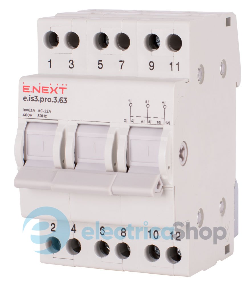 Выключатель на DIN-рейку на три положения e.is3.pro.3.63, 3р, 63А предназначен для переключения электрических цепей, переключения фаз, реверсирования двигателей, ручного переключения на резерв и т.п. Продукт используется в сетях, защищенных от токов короткого замыкания и перегрузки.