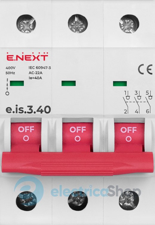 Выключатель нагрузки на DIN-рейку e.is.3.40, 3р, 40А предназначен для переключения электрических цепей, защищенных от коротких цепей и токов перегрузки.