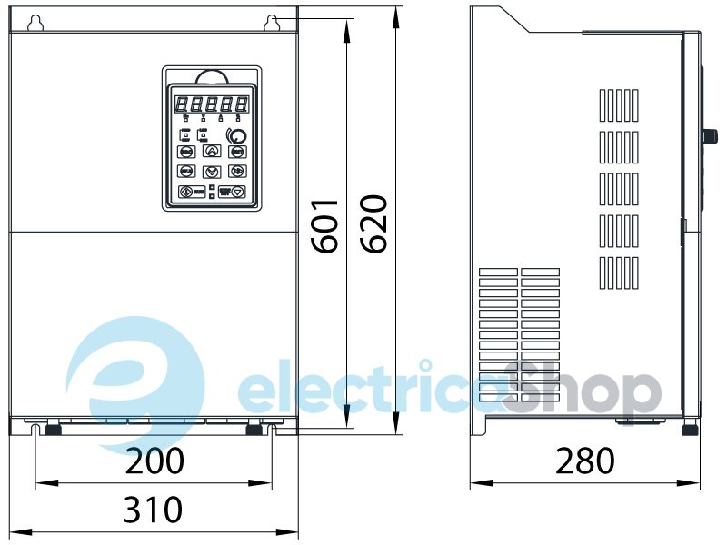 - Входы / выходы сигналов управления: 7 программируемых цифровых клемм среди которых 1 высокоскоростная импульсная клемма (до 100кГц), 3 программируемых аналоговых входа 0…+10В или 0…20мА, 2 цифровых программируемых выхода с открытым коллектором среди которых 1 высокочастотный импульсный выход (20 программируемых аналоговых выходы 0…+10В или 0…20мА, RS485 (Modbus RTU)