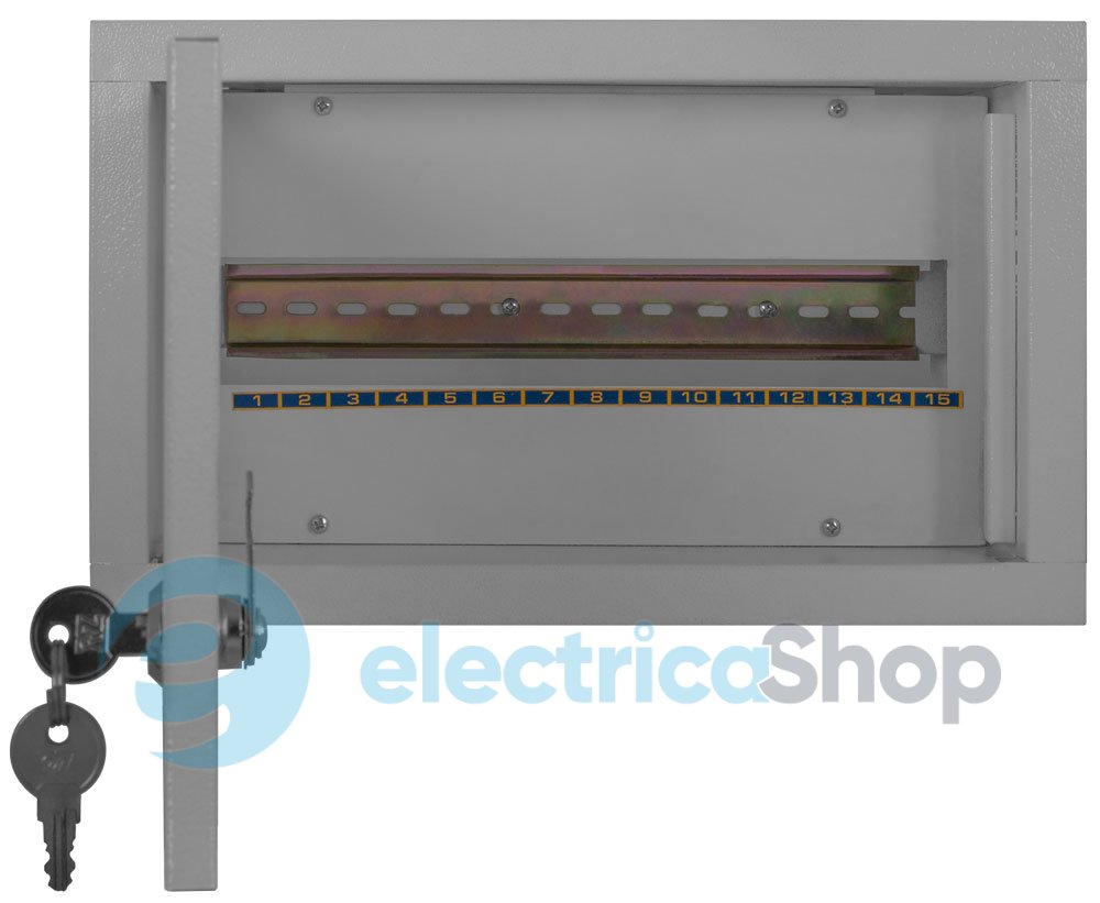<p>Шкаф металлический 15-модульный, встраиваемого исполнения с замком.</p> <h4>Основное назначение</h4> <p>Шкаф металлический модульный предназначен для монтажа модульного защитного и распределительного электрооборудования, модульных устройств автоматики, устройств управления и сигнализации в сетях 220/400В 50Гц.</p> <h4>Область применения</h4> <p>Системы энергоснабжения в жилом, офисном или производственном помещениях.</p> <h4>Конструктивные особенности (преимущества)</h4> Корпус выполнен из стального листа толщиной 0.5 мм. <br /> Покрытие: порошковая термореактивная краска белого или светло-серого цвета. <br /> Комплектуются DIN-рейкой и двумя ключами.<br /> Количество размещаемых рядов модулей: 1.<br /> Наличие двух кабельных вводов? 24 мм. в нижней части шкафа.