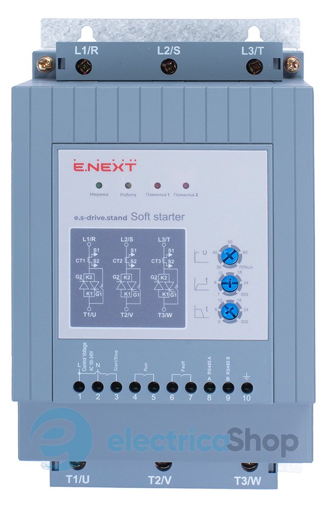 Устройство плавного пуска серии e.s-drive.stand ТМ ENEXT предназначено для плавного запуска асинхронных электродвигателей с целью снижения пиковых нагрузок как на двигатель, так и питающую сеть. Применяется в электрических сетях переменного тока, напряжением 220/380 В и частотой 50/60 Гц. Устройство оснащено встроенной функцией байпас.