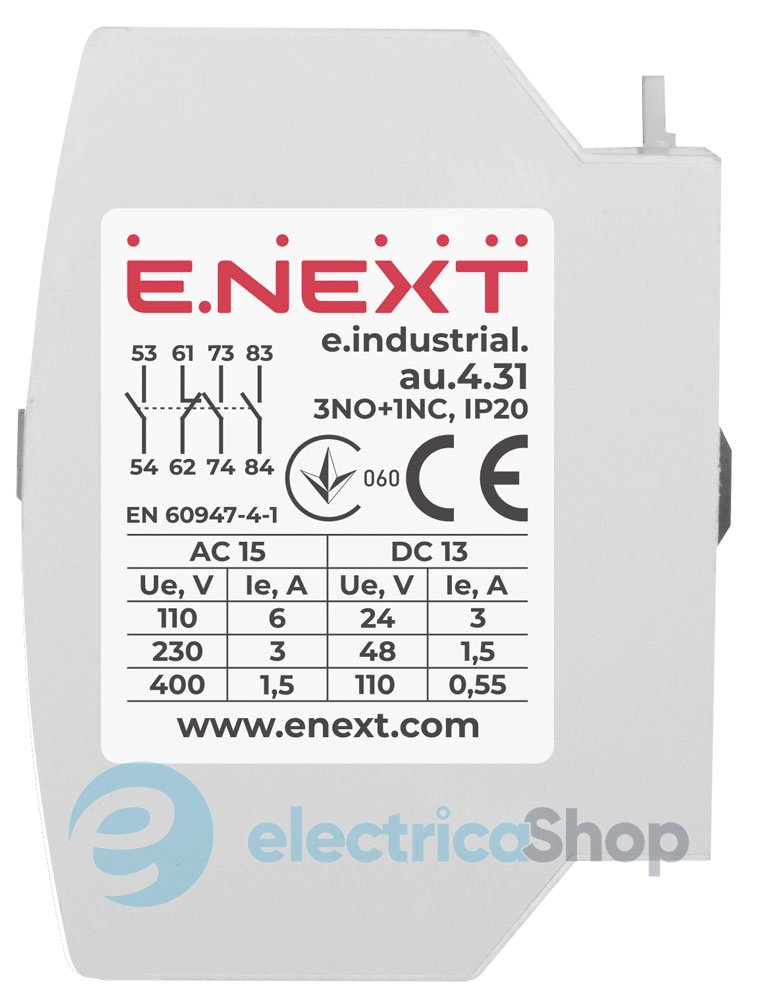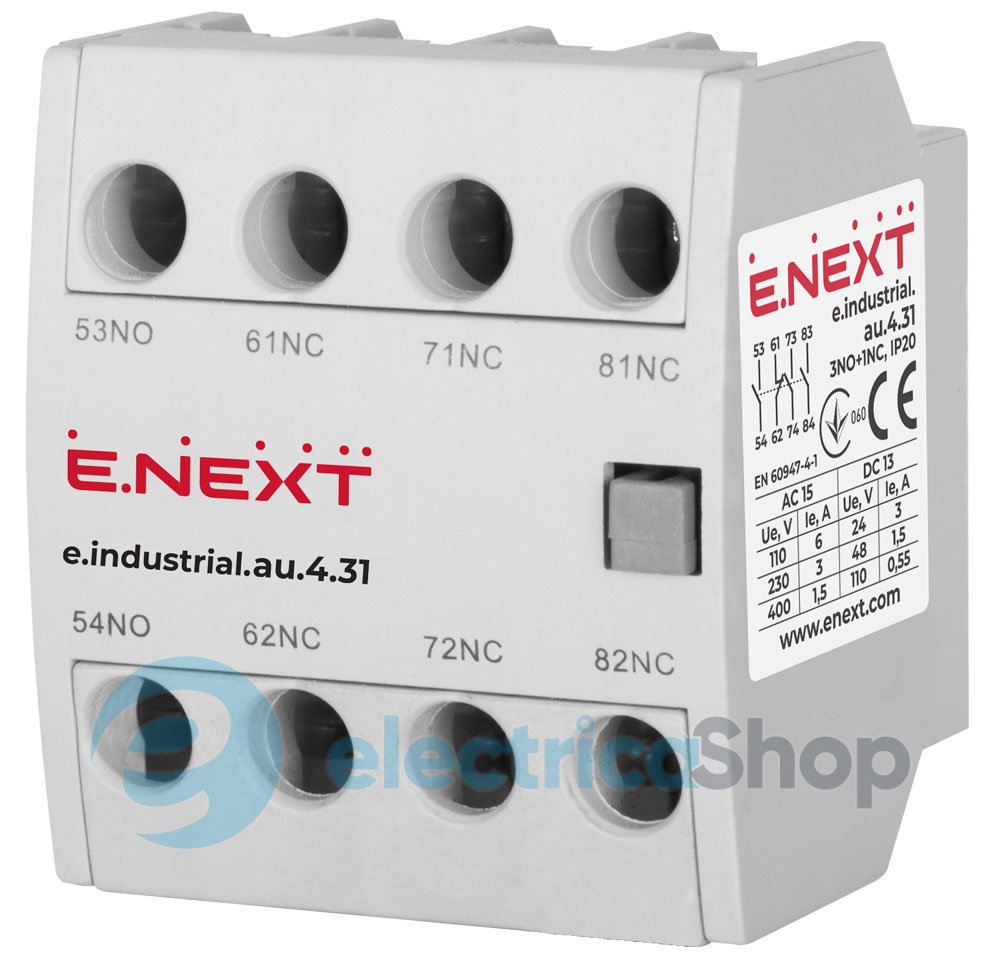 Дополнительный контакт e.industrial.au.4.31, 3no+1nc предназначен для обеспечения сигналов в цепях контроля, индикации и управления (элементы автоматизации процессов).