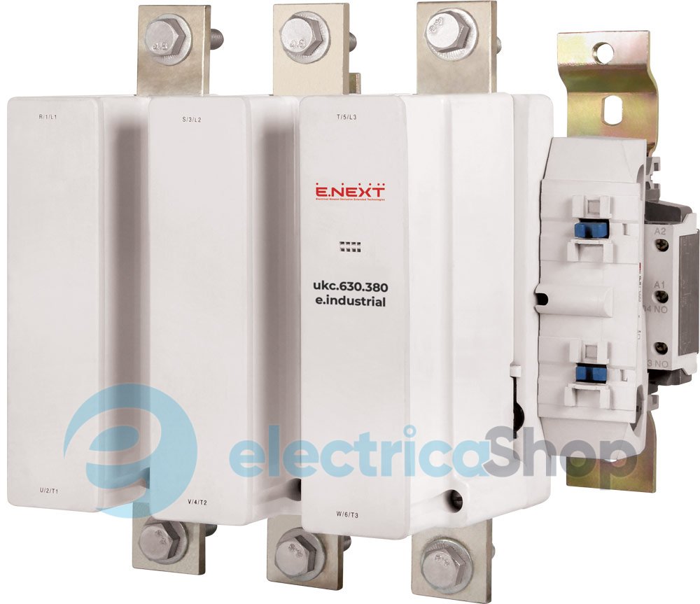 Контактор e.industrial.ukc.630.380, 630А, 380В, no предназначены для использования в стационарных установках дистанционного пуска, остановки и реверсирования непосредственным подключением к сети 3-фазных асинхронных электродвигателей с короткозамкнутым ротором, а также для короткозамкнутого ротора нагрузок.