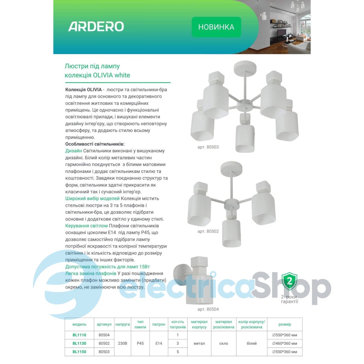 - Цвет плафонов: Белый