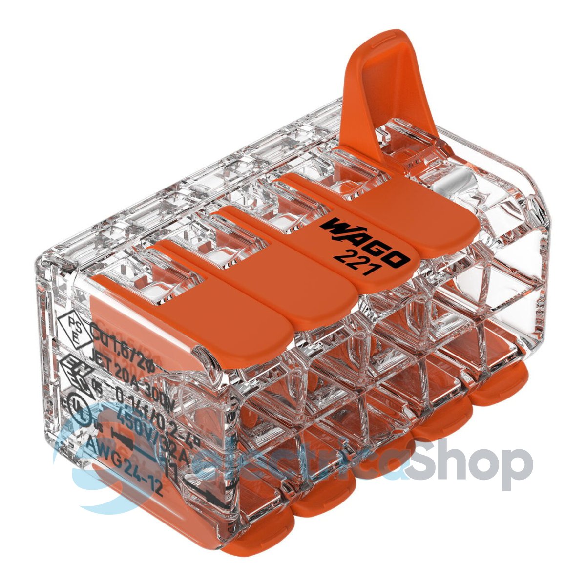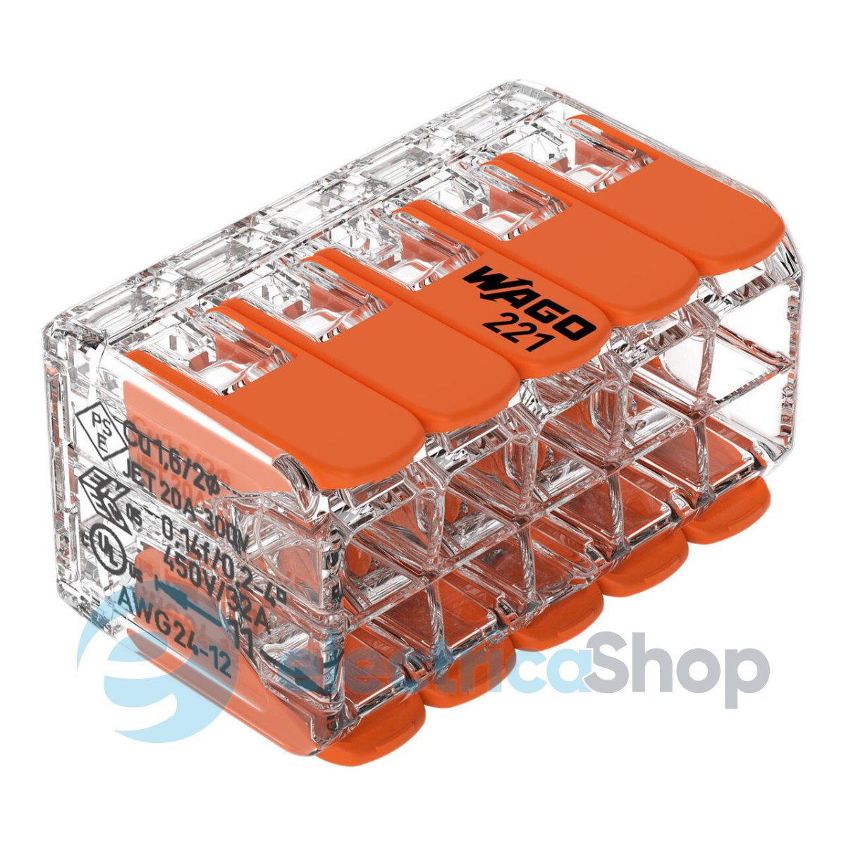 Клеммный зажим 5 входа (0.2-4.0 мм.кв) 32А / 450V CU, с рычажком WAGO 221-425 Green Range