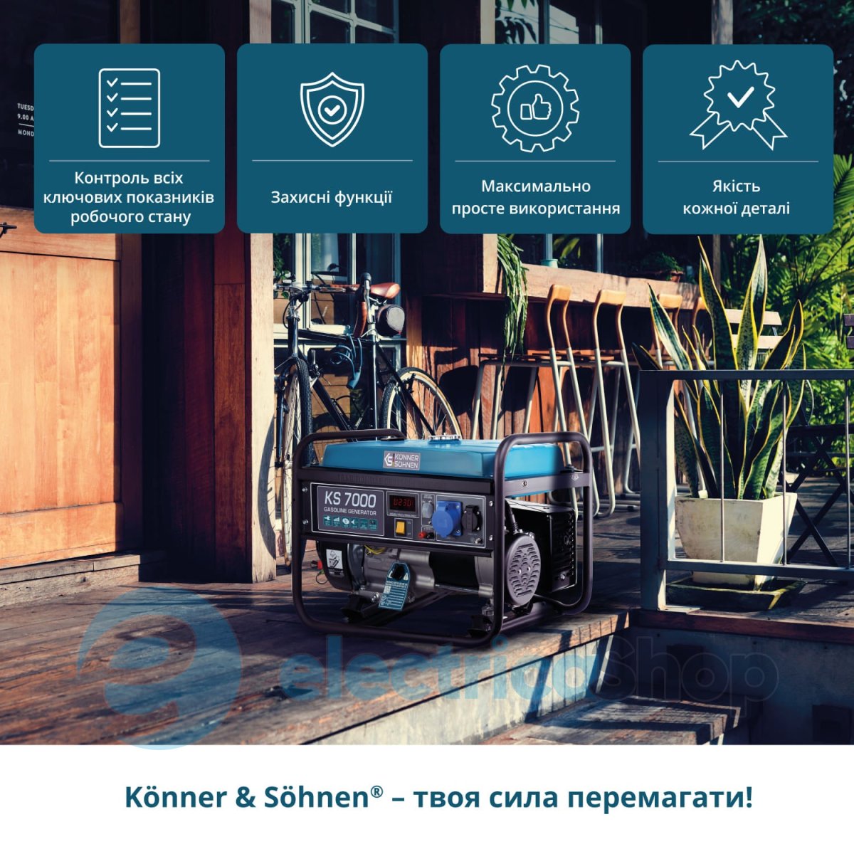 Двигуни відповідають усім світовим та європейським стандартам якості, економічності, екологічності (зокрема рівень шкідливих викидів та рівень шуму). Кожний двигун та кожний генератор мають свої індивідуальні серійні номери, що дозволяє нам контролювати якість виробництва та сервісного обслуговування. Двигуни Könner & Söhnen вирізняються легким стартом та пониженою вібрацією. Лінійка бензинових генераторів KS 7000 оснащена надійним 1-циліндровим двигуном потужністю 13 к.с. -