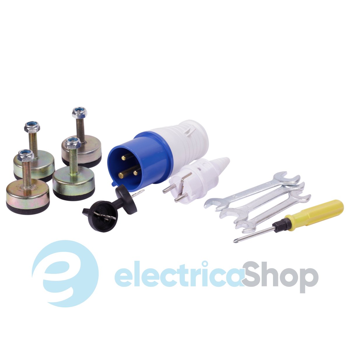 Генератор укомплектований додатковими аксесуарами: силова переносна вилка 3Р+Е+N, 16А, 400В, силова переносна вилка 2P+Е, 32А, 230В, ключ ріжковий 8×10 мм, ключ ріжковий 12×14 мм, ключ ріжковий 17×19 мм, викрутка двостороння 6.0 мм РН2. -