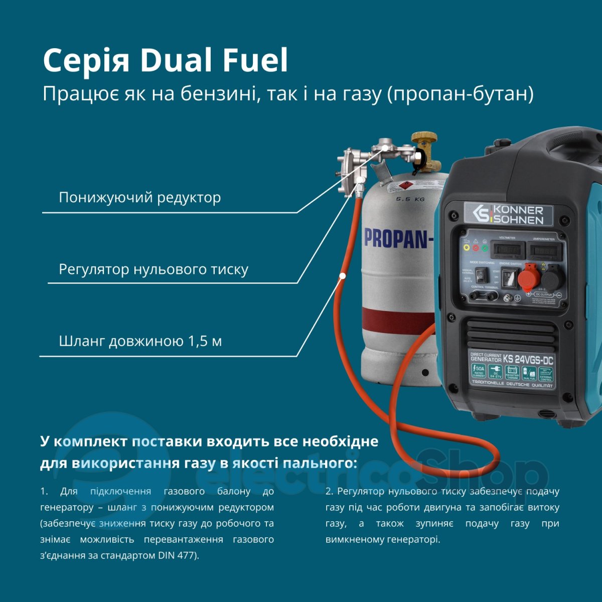 - Підтримка двох видів палива (бензин/LPG) - генератор може працювати як на бензині, так і на зрідженому газі (LPG), що дозволяє обирати найбільш вигідний та доступний вид палива.
