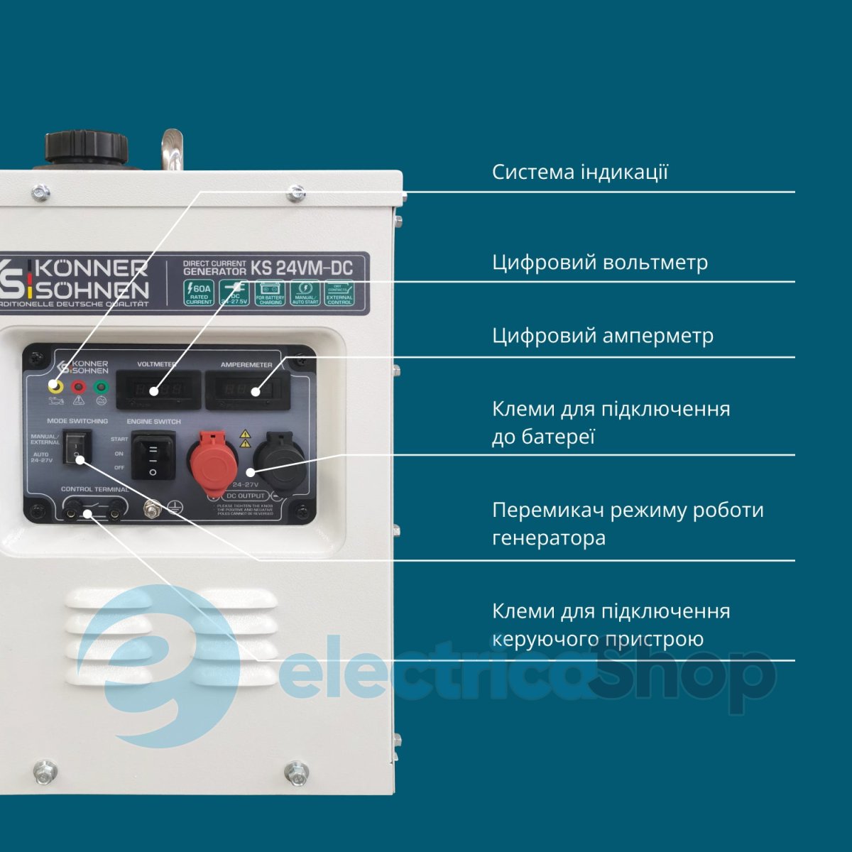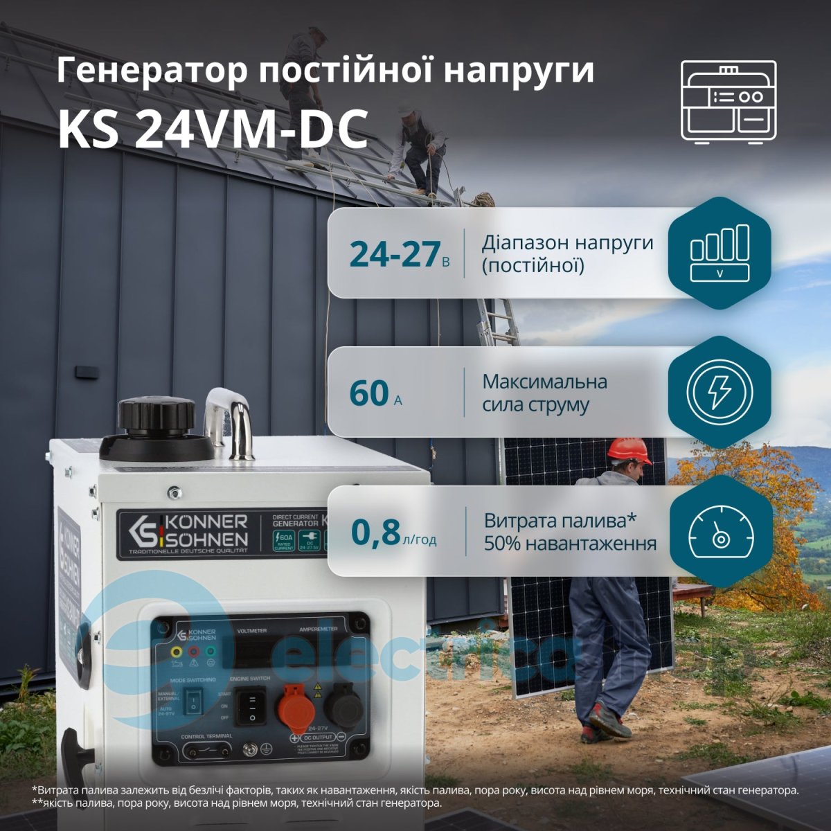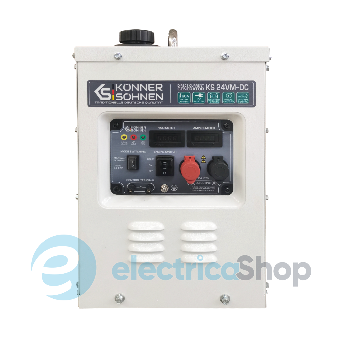Генератор постійної напруги 60A, (24-27,5В) німецької марки Könner & Söhnen® – потужний і надійний, розроблений як резервний зарядний пристрій для заряджання акумуляторів 24В. Заряджання акумуляторів від генератора DC є максимально ефективним, не потребує додаткових перетворювань напруги. Економія пального, порівняно зі заряджанням батареї від звичайних генераторів АС. Генератор має режим AUTO, в якому працює як зарядний пристрій та MANUAL/EXTERNAL, в якому можно завести генератор вручну або за допомогою зовнішнього пристрою. Міцний металевий кожух знижує шум і захищає від пошкоджень. Оснащений системою моніторингу.