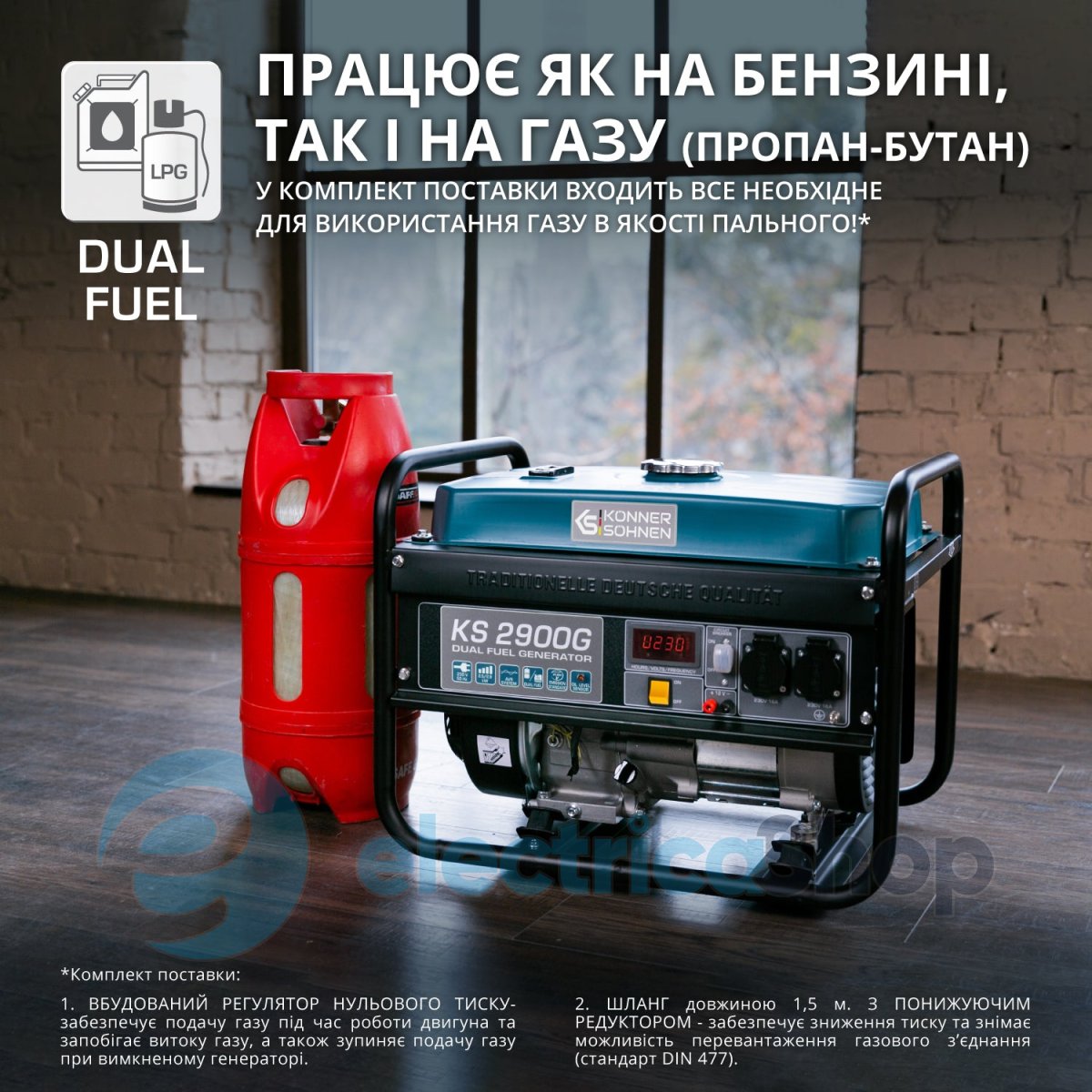 3. Для підвищення надійності газової магістралі на шланг встановлений понижуючий редуктор, який кріпиться на балон (стандарт DIN 477). Він забезпечує зниження тиску та знімає можливість перевантаження газового з’єднання. Потрібно лише під’єднати генератор до балону та запустити двигун.