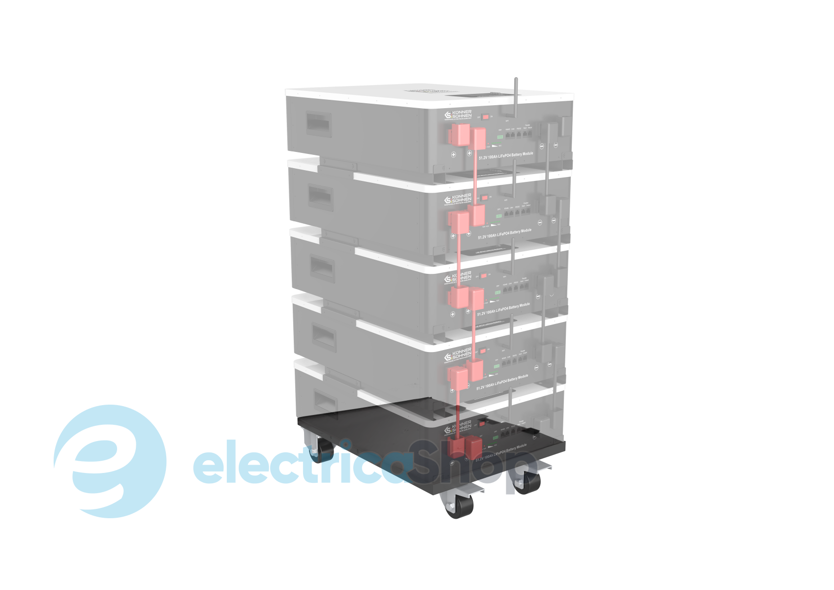 Підставка на чотирьох колесах, спеціально розроблена для встановлення та легкого переміщення важких літієвих батарей в потрібне місце, мінімізуючи фізичні зусилля. Підставка оптимізує розміщення 5 батарей.