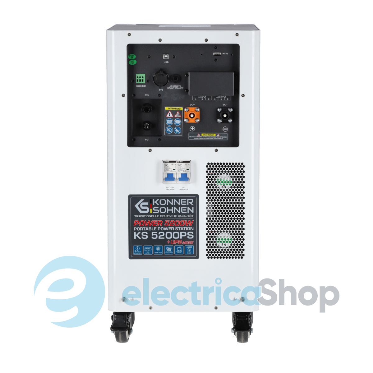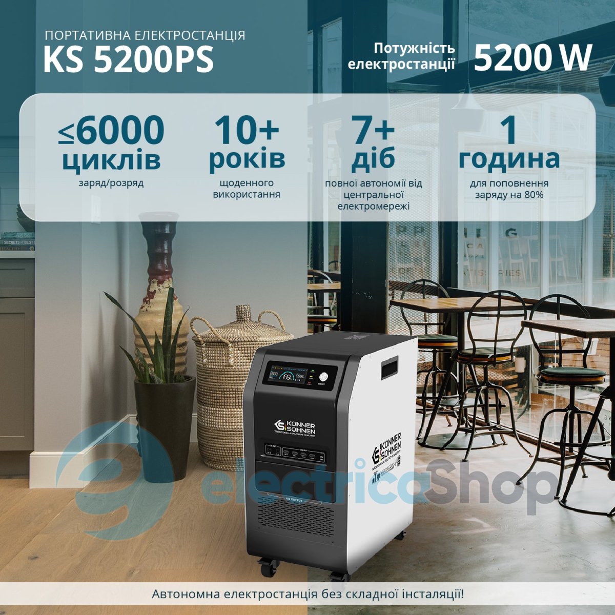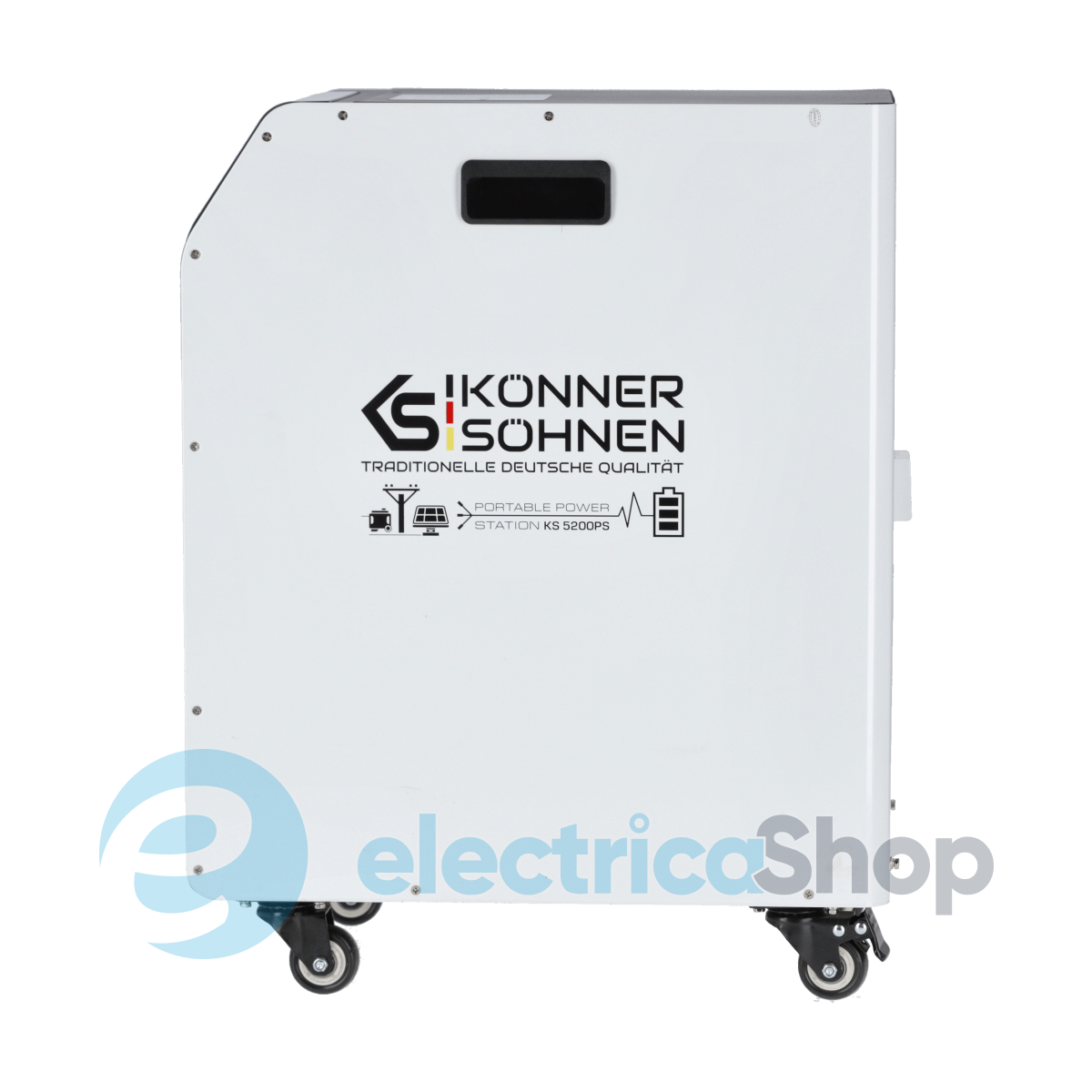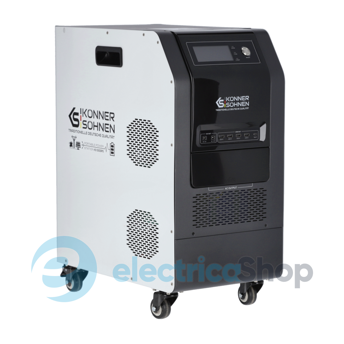 Könner & Söhnen KS 5200PS — це ядро гібридного енергетичного хабу із мультифункціональною електростанцією 3-в-1, що об’єднує інвертор із “чистим” синусом, MPPT-контролер і LiFePO₄-акумулятор 5,12 кВт⋅год. Станція дає змогу заряджатися від чотирьох джерел — мережі, сонячних панелей, зовнішньої батареї або генератора постійного струму. Завдяки DC-виходу 48V вона підтримує інтеграцію з генераторами KS 48V-DC через систему Tandem Power, яка автоматично оптимізує роботу та зменшує витрати палива. Надійна та тиха — ця станція готова до автономної роботи 24/7 вдома чи у бізнесі або у разі аварійного відключення.