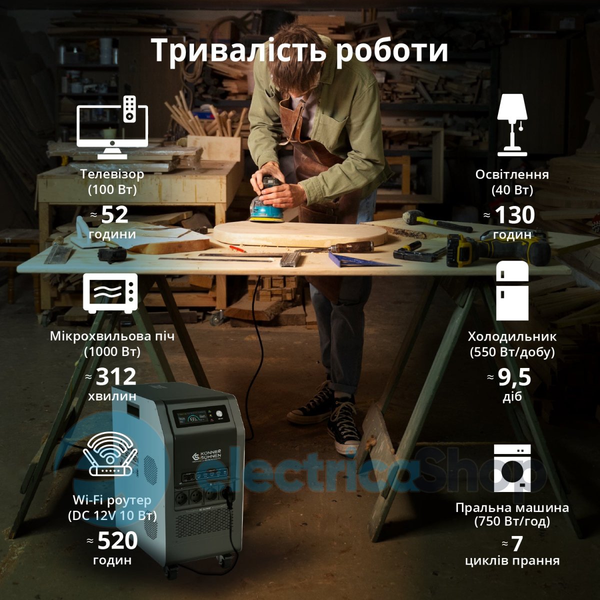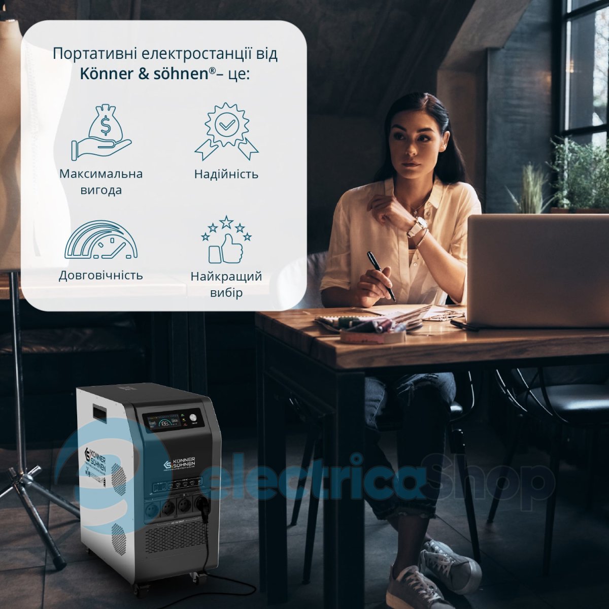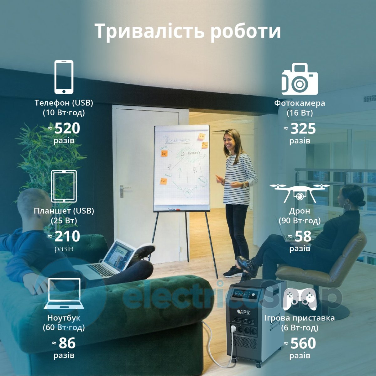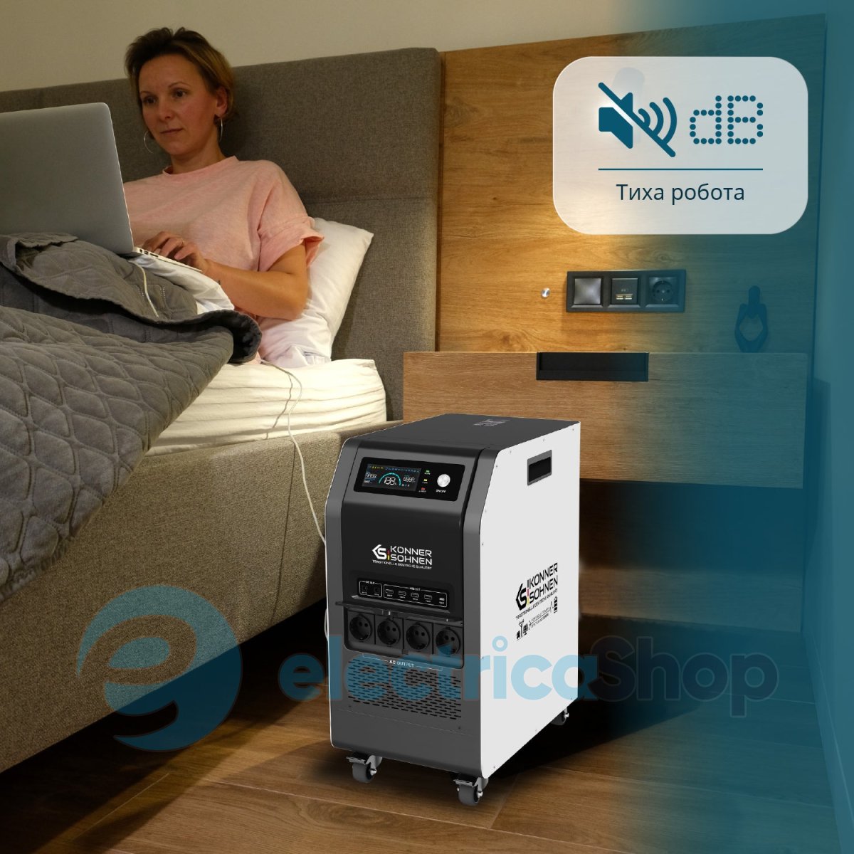 - Безперервне живлення (ДБЖ): Електростанція забезпечує безперебійне живлення підключених пристроїв навіть під час відключень електроенергії або коливань напруги в мережі. Станція перемикає на себе живлення протягом мілісекунд, захищаючи від втрати даних, пошкодження пристроїв та перерв у роботі.