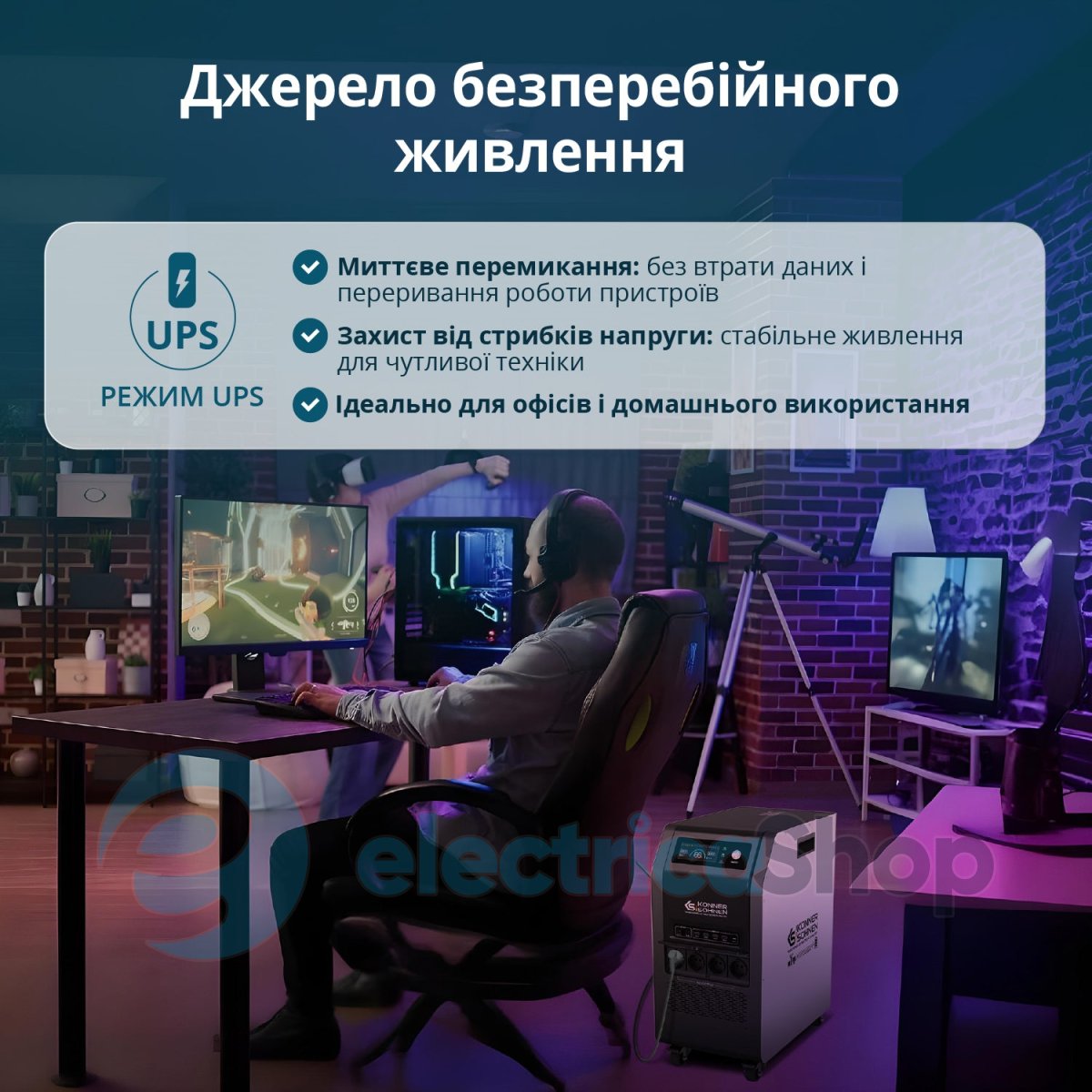 - Функція ДБЖ для безперервної роботи – автоматичне перемикання живлення за <10 мс захищає чутливу техніку від збоїв, дані – від втрат, а бізнес – від простою.