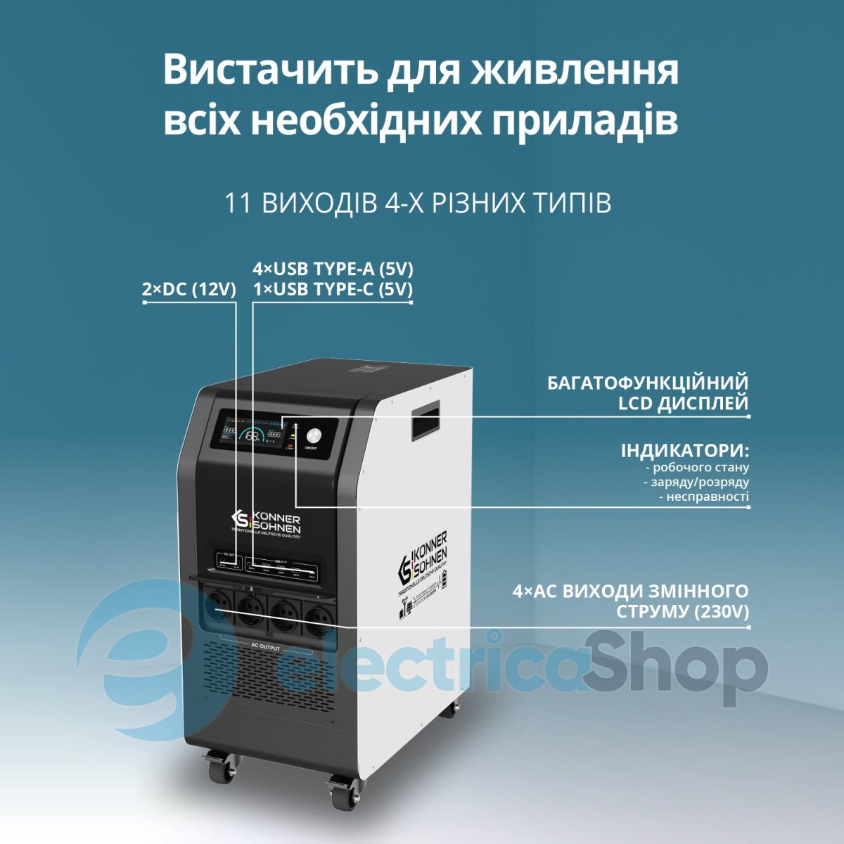 - Вихід змінного струму:4 × Schuko 230 V + термінал на задній панелі