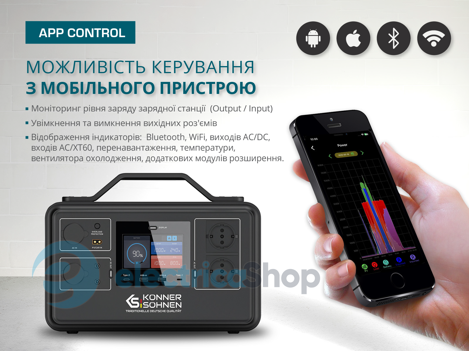 Дозволяє керувати портативною електростанцією безпосередньо через застосунок: моніторинг рівня заряду, увімкнення та вимкнення вихідних портів, ліхтаря. Застосунок дозволяє здійснювати одночасне управління декількома пристроями. -