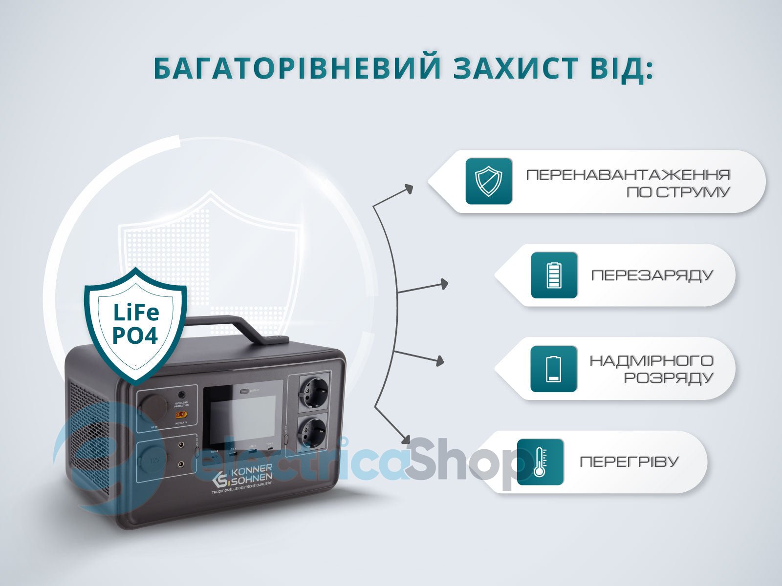 Багаторівневий захист від: перевантаження струмом, перезарядження, надмірного розряду, перегріву. -