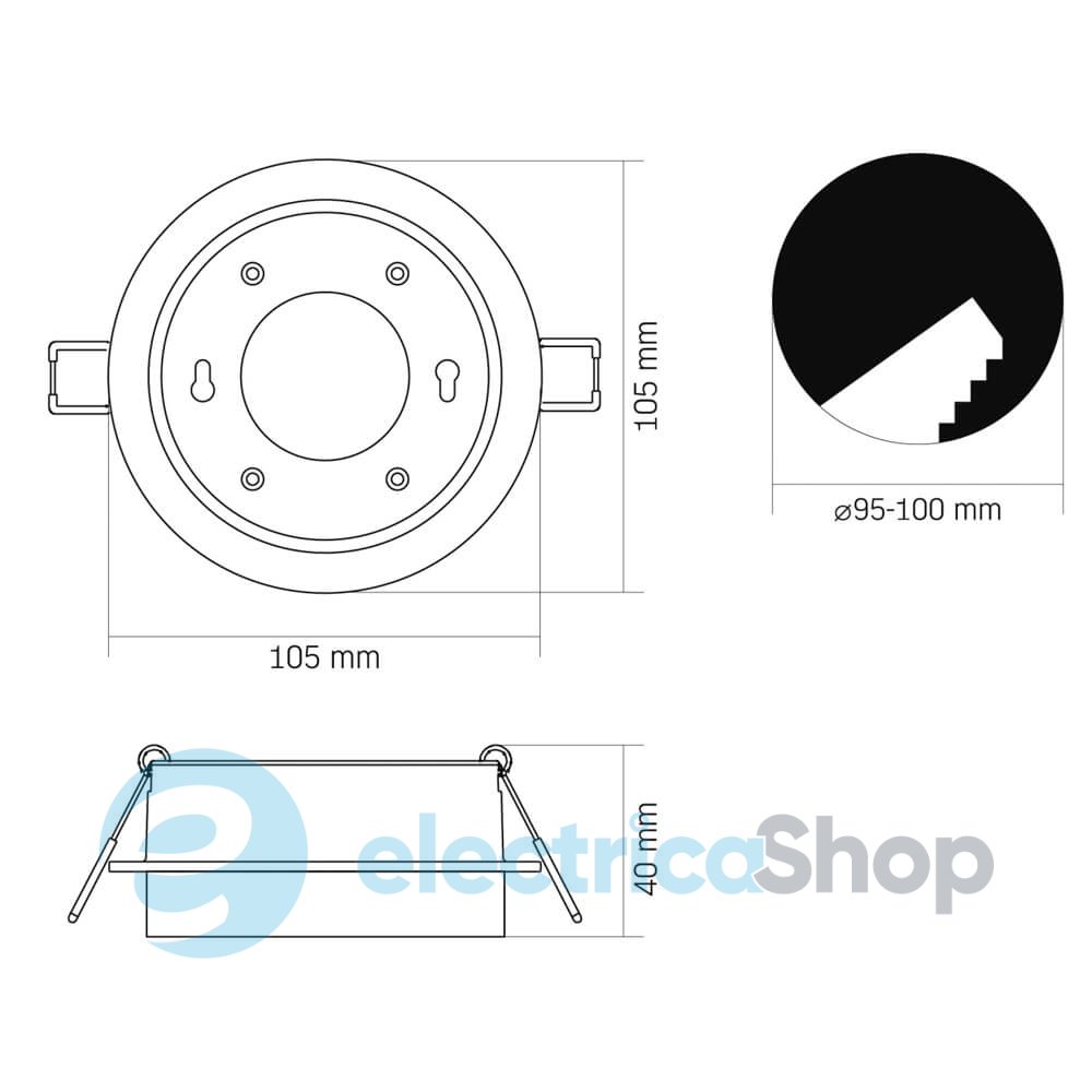 - Диаметр врезного отверстия: 95-100 мм.
