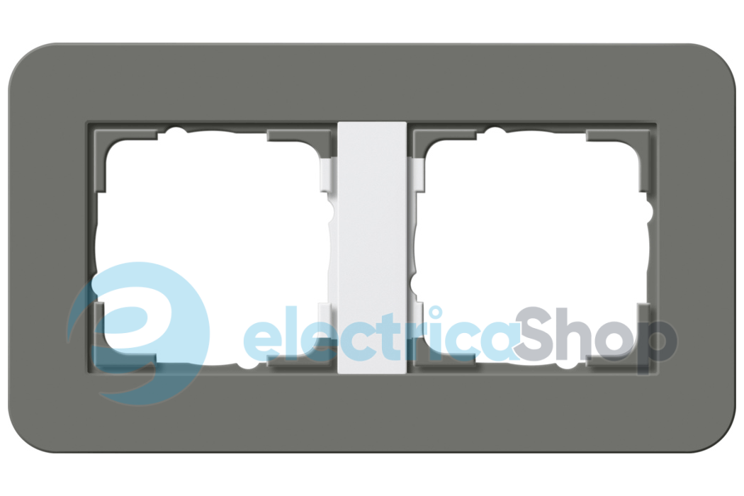 Установочная рамка Gira E3 с мягкой на ощупь поверхностью темно-серого цвета с несущей рамкой белого цвета.