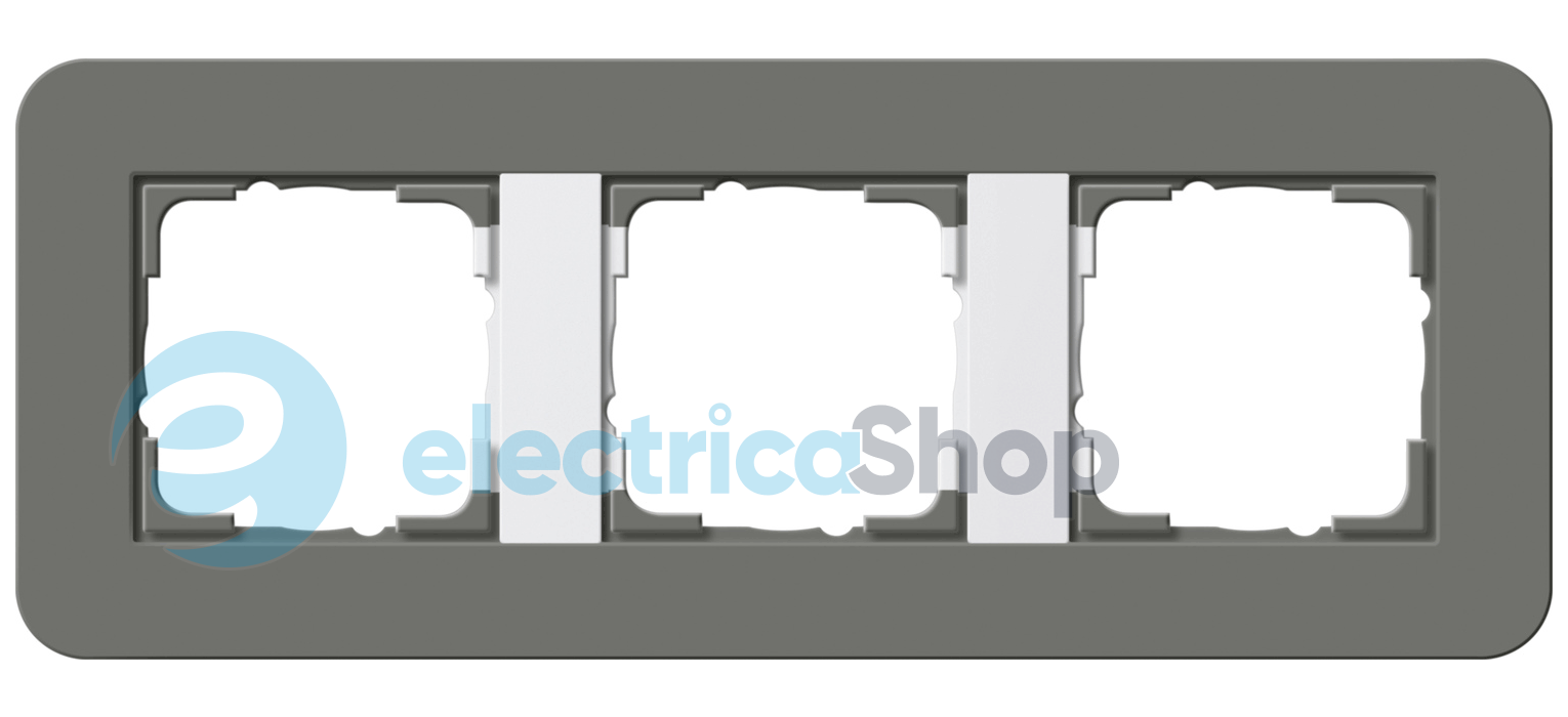 Установочная рамка Gira E3 с мягкой на ощупь поверхностью темно-серого цвета с несущей рамкой белого цвета.