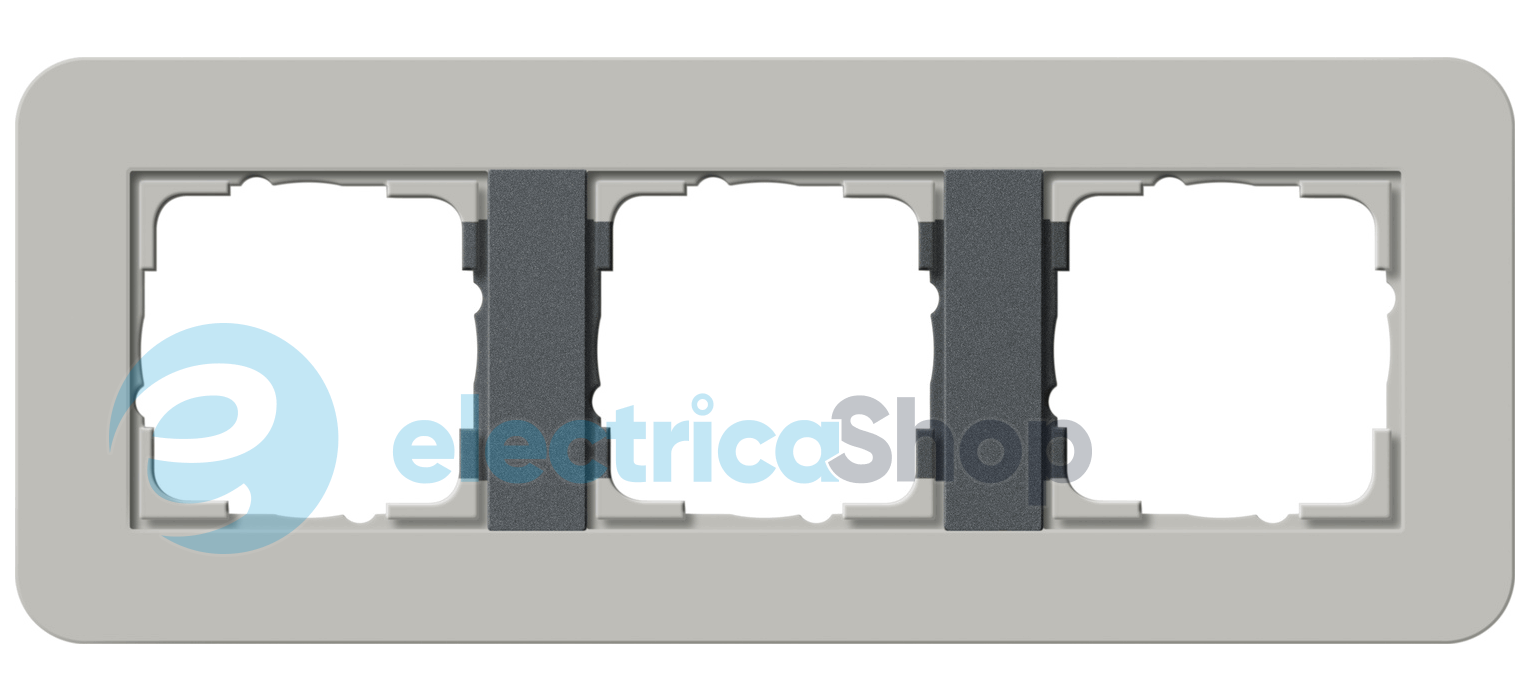 Установочная рамка Gira E3 с мягкой на ощупь поверхностью серого цвета с несущей рамкой антрацитового цвета.