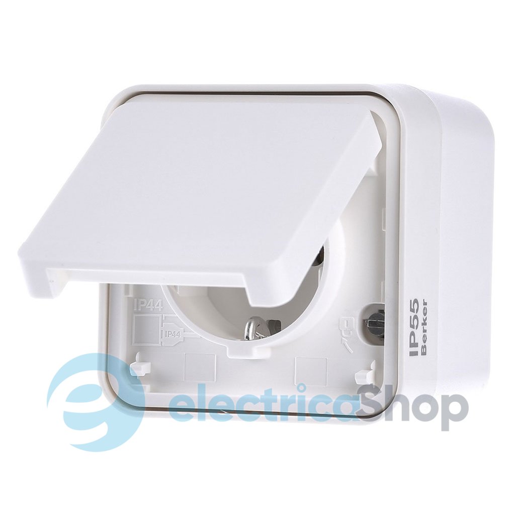 Электророзетка SCHUKO с откидной крышкой, для наружного монтажа.