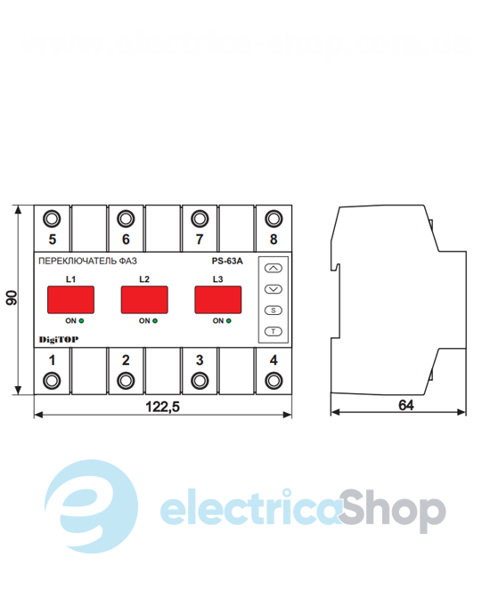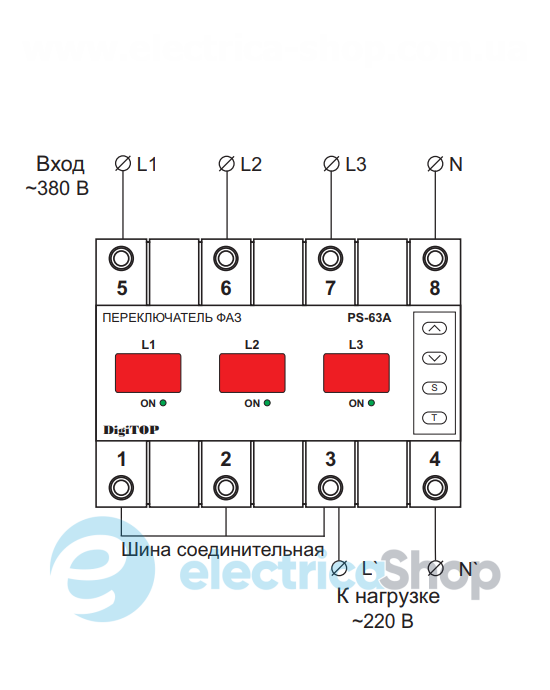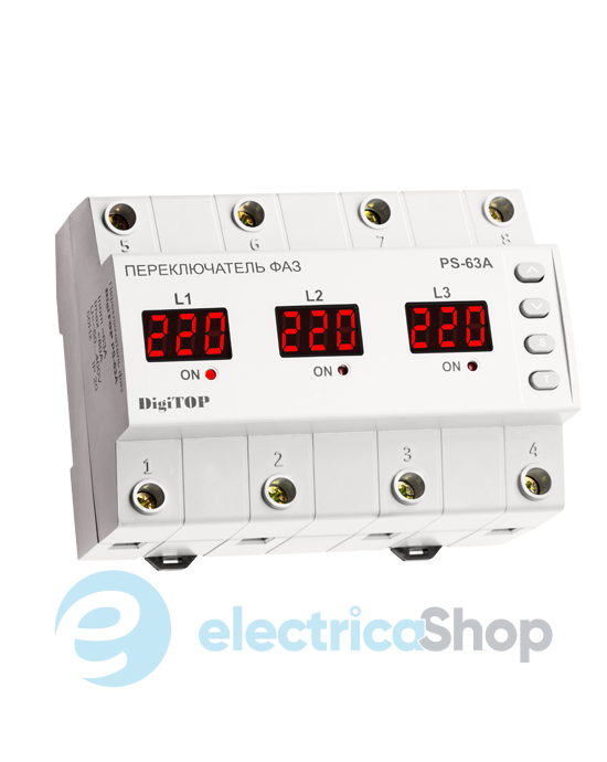 Переключатель фаз PS-63A производства DigiTOP предназначен для питания промышленной и бытовой однофазной нагрузки 220 / 230В 50Гц от одной из фаз трехфазной сети, с целью обеспечения питания особо ответственного однофазного оборудования от наиболее качественной фазы и защиты его от повышенного или пониженного напряжения.